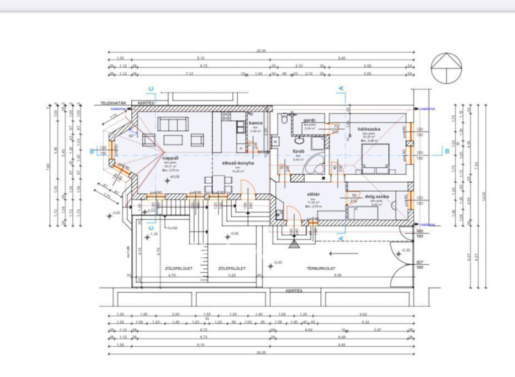 60m2 fedett, burkolt terasz, 380W kiállás (jakuzzinak vagy nagy teljesítményű sütőnek) + műfű.