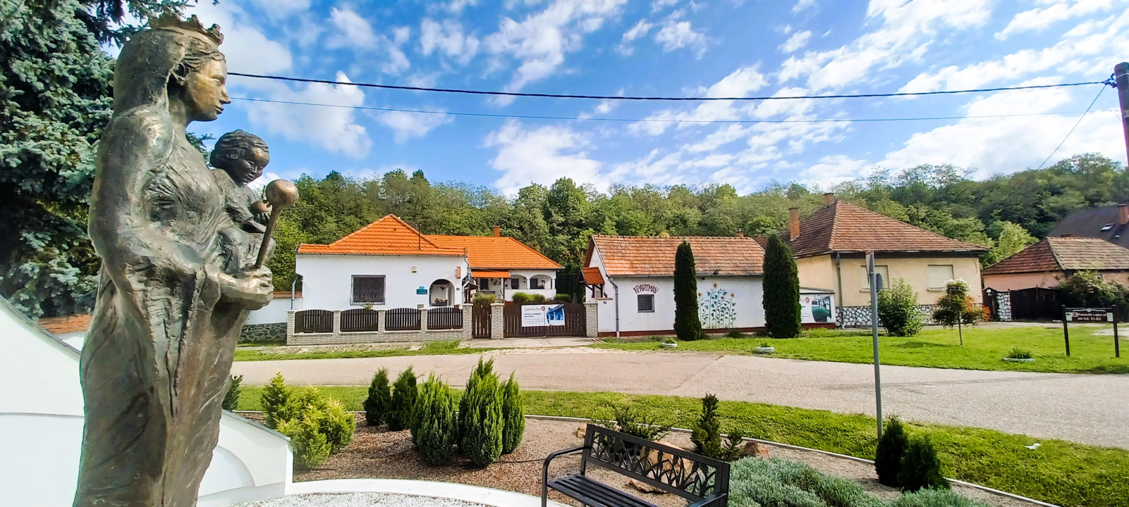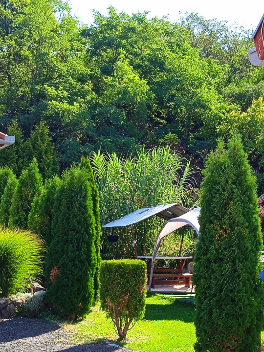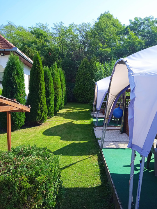 Parkosított kert grillezővel, bográcsozóval, fedett vendéglátóhelyekkel.