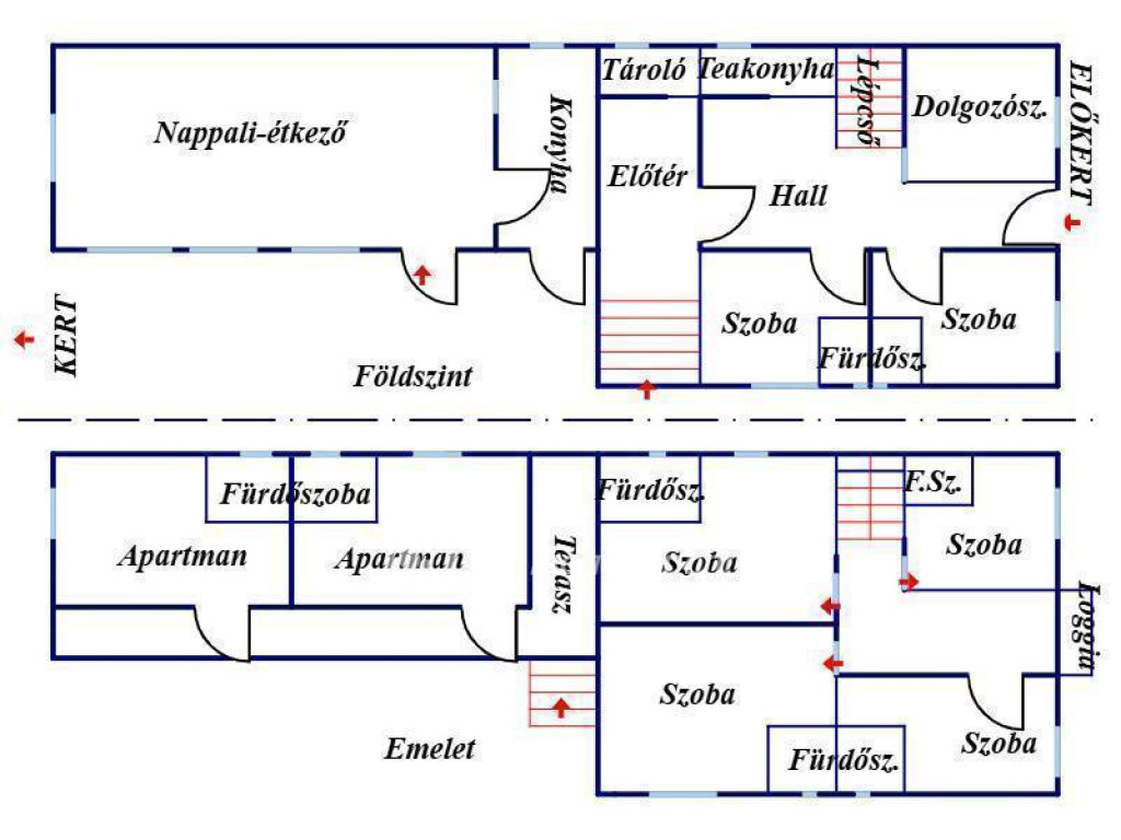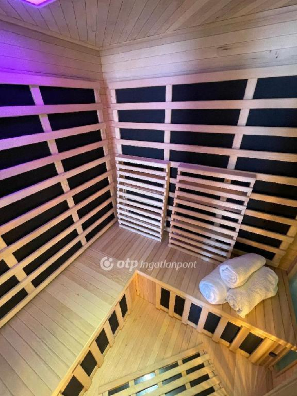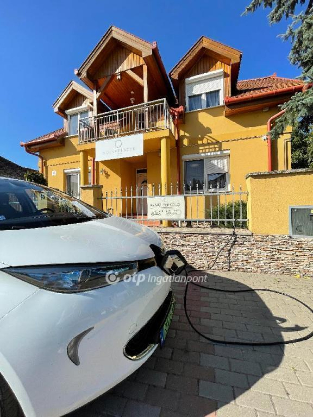 Kényelmet bíztosít több generáció együttélésére, de KIVÁLÓAN ALKALMAS VENDÉGHÁZ ÜZEMELTETÉSÉRE IS! A környező dombokra is panorámás: 1404 m2 telken épült ez az ingatlan külön bejáratú apartmanokkal. A mai kor elvárásai szerint megtervezett ingatlan minden részlete az építtetők igényességének az összhangját mutatja. Az építészeti koncepció egyedi belsőépítészeti megoldásokkal és a minőségi anyagok használatával párosult, a legkorszerűbb műszaki elvárások szerint. A két szintre tagozódó épület alsó szintjén egy hall, dolgozószoba, 2 szoba fürdőszobával, tágas közösségi tér, étkező, a teraszon szaunával valamint a kiszolgáló helyiségek ( tároló, mosókonyha, toilet ) kerültek kialakításra. Az első szint a vendéglakrészeké, saját fürdőszobákkal, terasszal. Valamennyi szoba fali klímával felszerelt, az épületben mozgásérzékelős riasztórendszer, valamint a közlekedő és a nappali helyiségekben mozgásérzékelős, időkapcsolós lámpákkal és biztonsági kamerarendszer található.