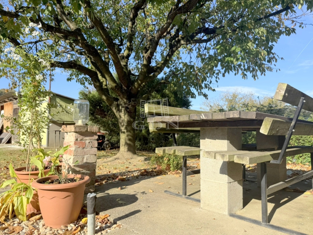 A terület cca. 800 m2, melyen szépen elkülönülnek a pihenésre és játékra szolgáló részek a veteményes és gyümölcsfák birtokától.