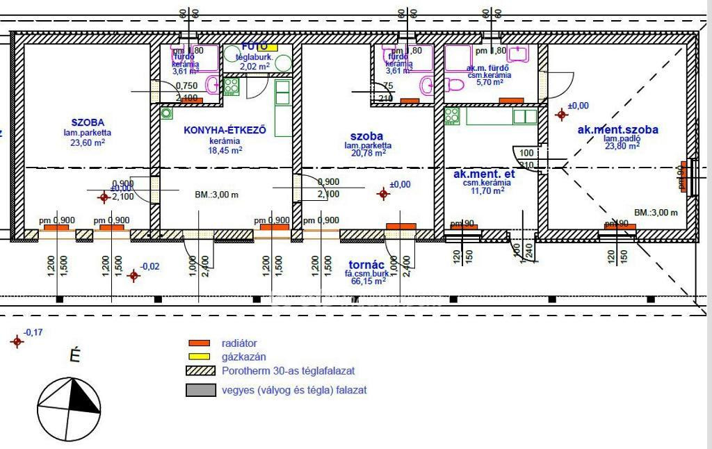 Helyiségek: régi épület: 80,07 m2, köztük: 22,32 m2 fedett terasz, új épület: 113,27 m2, tornác 66,15 m2. 1. épület: 2 szoba, konyha, étkező, fürdő+WC, plusz külön WC, előtér. 2. épület: 3 szoba (előtér-konyha, konyha-étkező, 3 zuhanyzó-WC egyben. A ház alatt egy 25,3 m2-es pince!!!