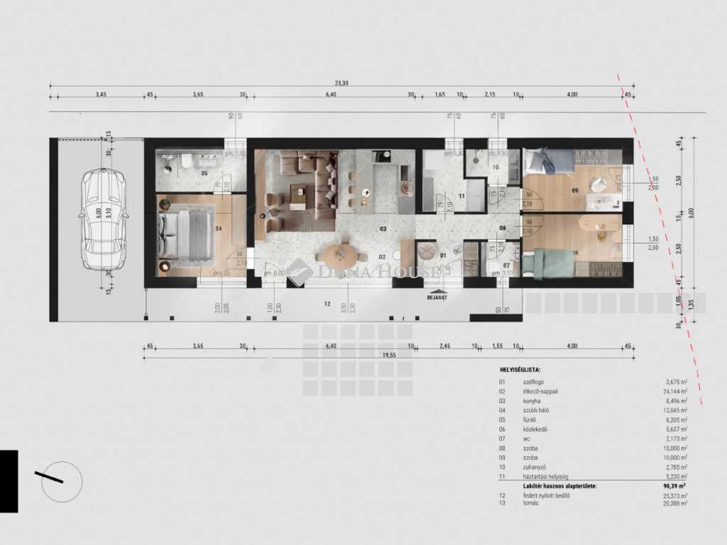 A település egyik rendezett utcájában kerülnek kialakításra az igényes megjelenésű, magas műszaki tartalommal bíró házak. Telkenként két lakóegység kerül kialakításra egymástól teljesen elválasztva, egyenként kizárólagos használatú kertekkel. A lakóépületek nettó alapterülete 90,39 nm, közéjük 1-1 autó elhelyezésre szolgáló, (25,4 m2) fedett autóbeálló kerül. A házak itt érnek össze, lakóhelyiség falai nem érintkeznek egymással, továbbá egy-egy felszíni gépkocsibeálló is kialakításra kerül. A házak mindegyikénél nyitott 20,4 nm alapterületű tornác jellegű fedett terasz szolgálja a teljes kényelmet, közvetlen kapcsolattal a nappaliból.
