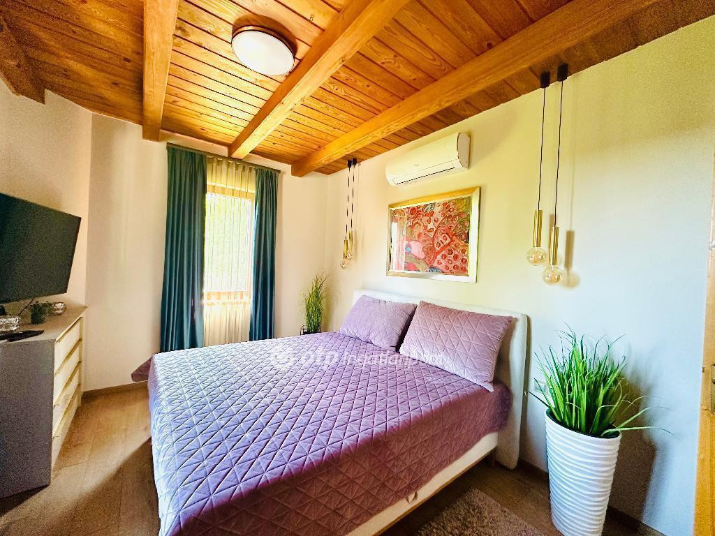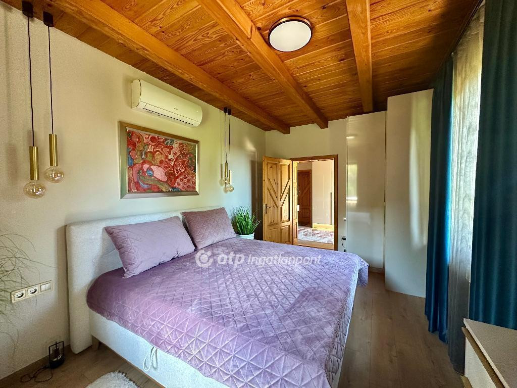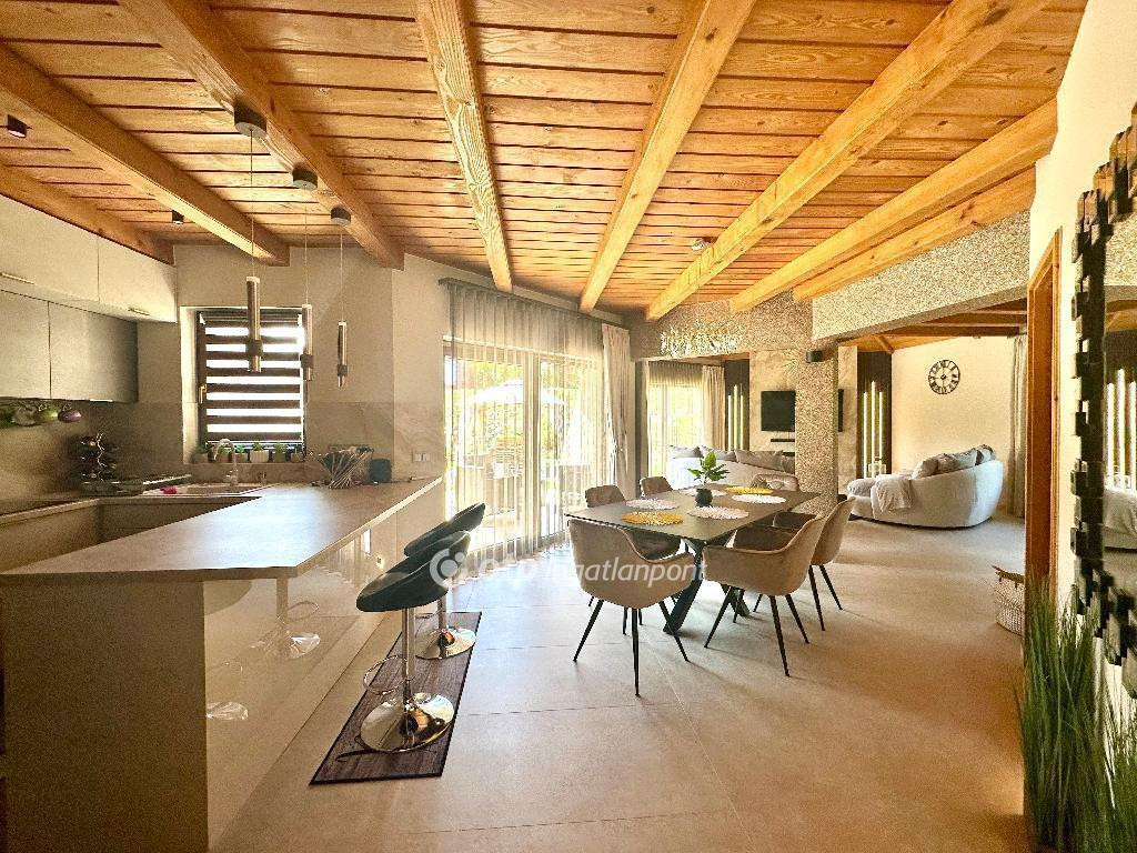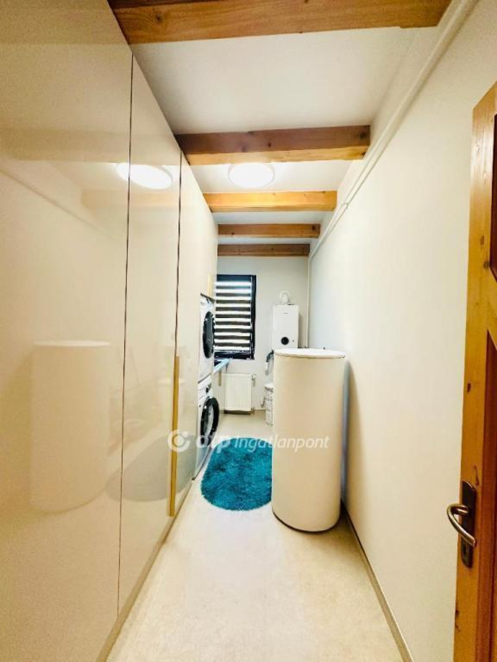 A ház három hálószobával, tágas amerikai konyhás nappalival, étkezővel rendelkezik, továbbá fürdőszoba, külön WC, valamint egy mosókonyha gardróbbal egészíti ki a mindennapi kényelmet. A ház egyik sajátossága a mindenhol megjelenő látszó gerenda, amely tökéletes összhangban áll a beltéri ajtókkal, így adva egységes, harmonikus megjelenést az otthonnak. A minőségi burkolatok, a hangulatvilágítás, az ízlésesen megválasztott lámpatestek, valamint az elegáns függönyök mind azt mutatják, hogy az ingatlan kialakításánál nagy gondot fordítottak a részletekre. A bútorzat szintén igényes, a vételár részét képezi, így az új tulajdonosnak csak a személyes dolgait kell egy költözés során magával hoznia - megspórolva ezzel további kiadásokat.