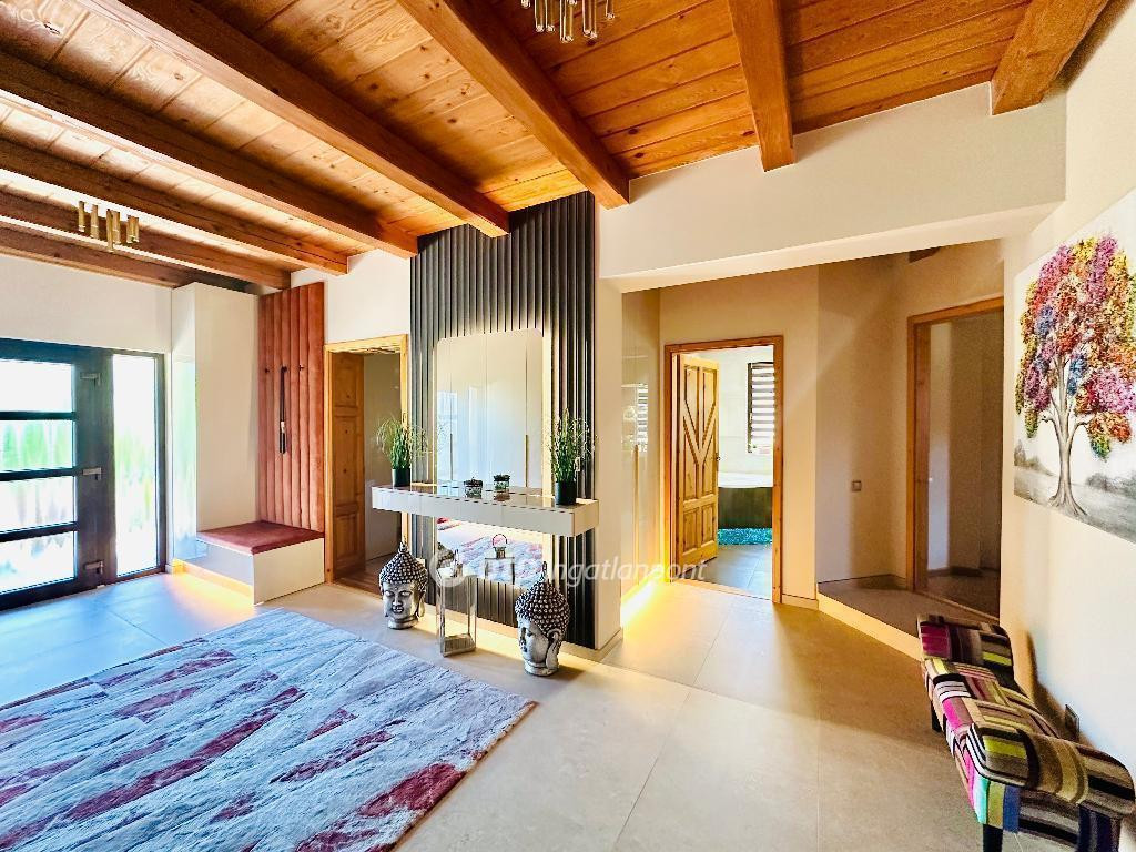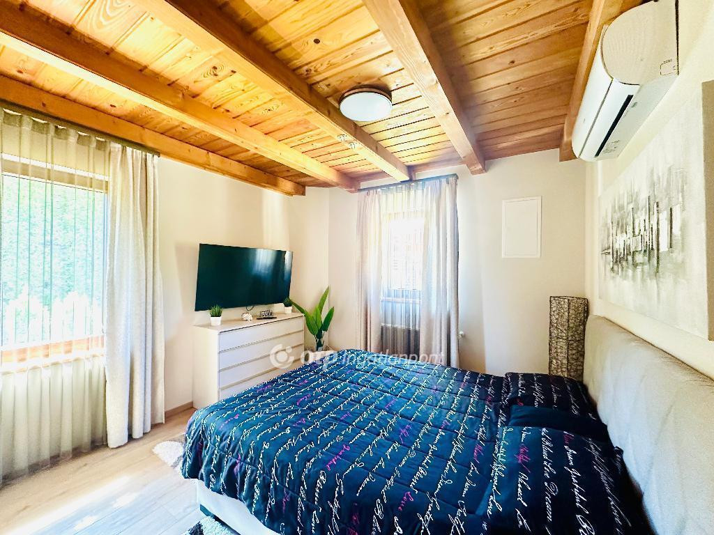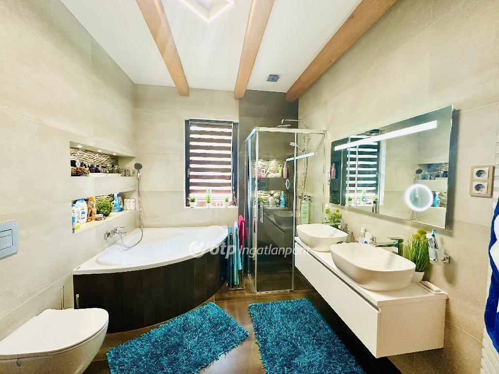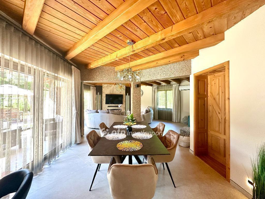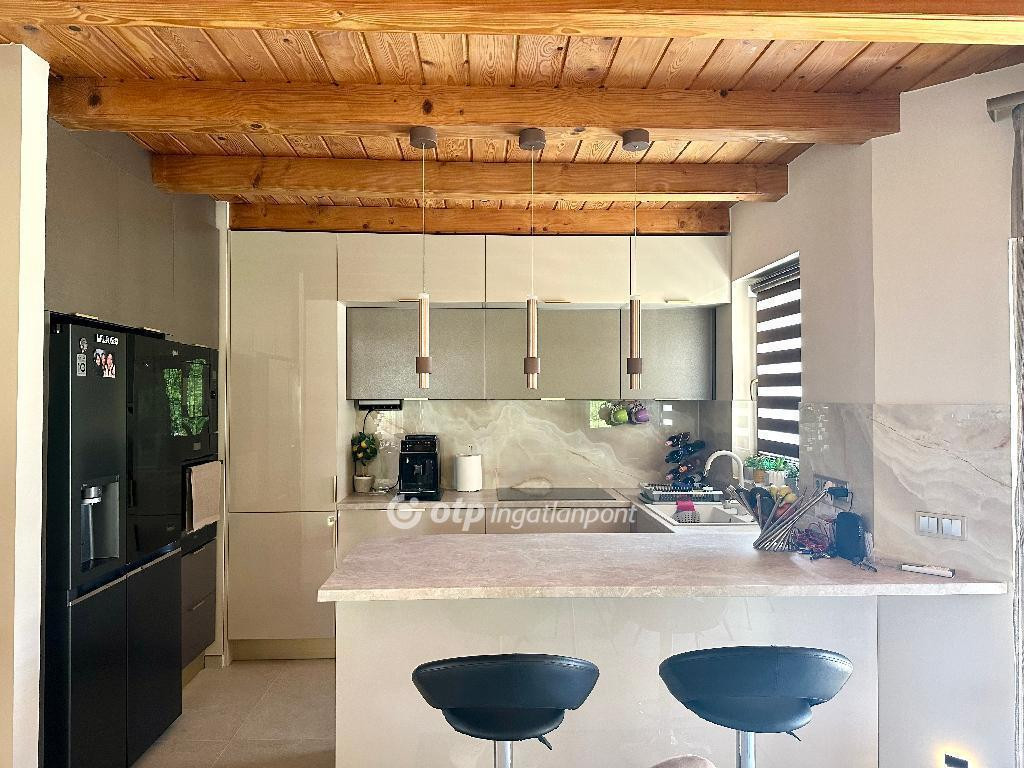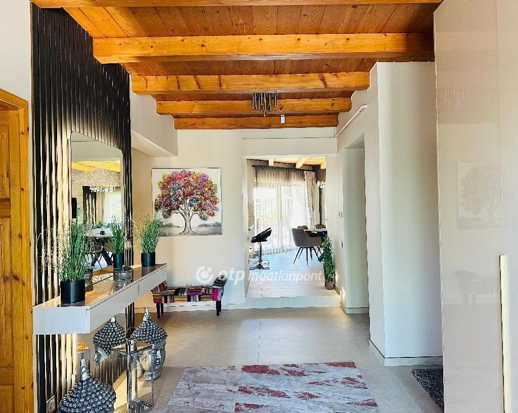 A ház három hálószobával, tágas amerikai konyhás nappalival, étkezővel rendelkezik, továbbá fürdőszoba, külön WC, valamint egy mosókonyha gardróbbal egészíti ki a mindennapi kényelmet. A ház egyik sajátossága a mindenhol megjelenő látszó gerenda, amely tökéletes összhangban áll a beltéri ajtókkal, így adva egységes, harmonikus megjelenést az otthonnak. A minőségi burkolatok, a hangulatvilágítás, az ízlésesen megválasztott lámpatestek, valamint az elegáns függönyök mind azt mutatják, hogy az ingatlan kialakításánál nagy gondot fordítottak a részletekre. A bútorzat szintén igényes, a vételár részét képezi, így az új tulajdonosnak csak a személyes dolgait kell egy költözés során magával hoznia - megspórolva ezzel további kiadásokat.