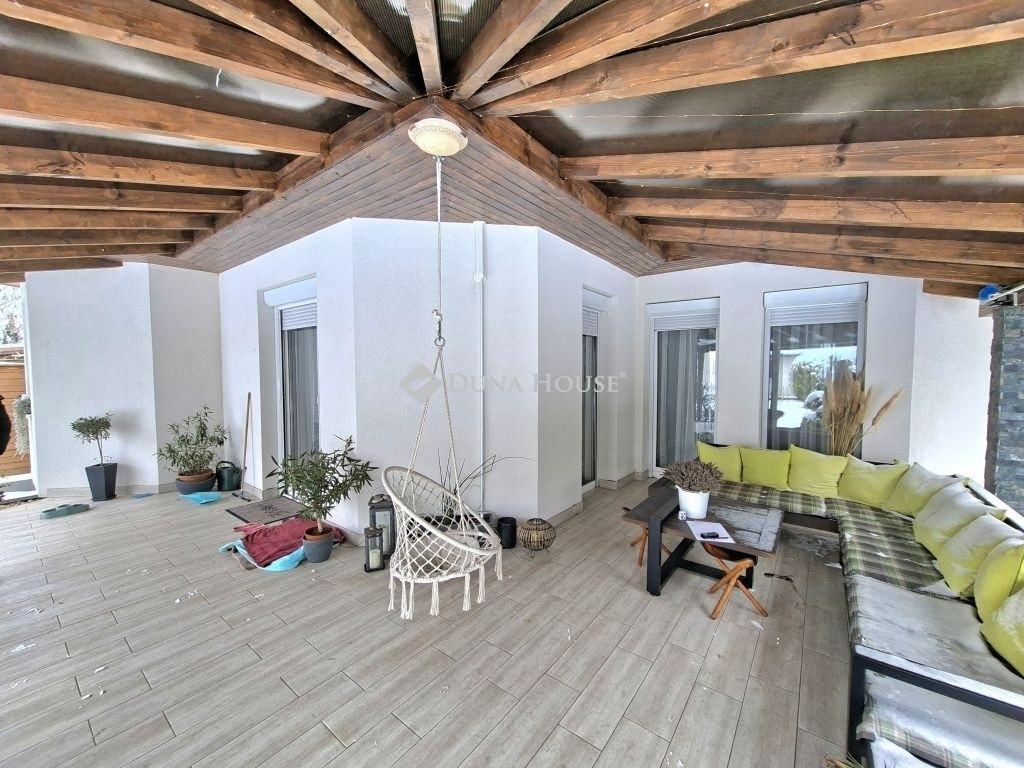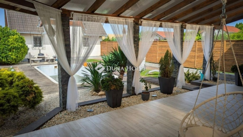 Enying-Balatonbozsok Rózsadombján ELADÓ 2 generációnak vagy akár Falusi Túrizmusra is alkalmas 2 külön álló ház medencével!A fő épület 80m2- es 2 szoba,(3 szoba kialakítása is lehetséges) amerikai konyhás nappali, fürdőszoba-wc, wc, háztartási helyiség, és a hálószobából valamint a nappaliból is a 24 m2- es fedett teraszra való kilépéssel.A másik ház 78 m2- es 20 m2- es garázs, konyha, nappali, Fürdő-wc, háztartási helyiség valamint a tetőtérben 35 m2- es egy légterű szoba kialakítással.A két ház között 7mx 3,5 m- es 1,5 m mély fedett medence található gyönyörű parkosított környezetben.Az épületek 2007-ben épültek tégla falazattal cserép fedéssel, 877 m2- es telken helyezkednek el.2014-ben teljeskörű felújítás történt. A fődémre 20 cm-es szigetelés került, kondenzációs gázkazán biztosítja az otthon melegét radiátoros hőleadással, valamint 2 hűtő-fűtő klíma is gondoskodik a kellemes hőmérsékletről az év minden szakában.Teljes burkolat csere is történt, új fürdőszoba kialakítással.Kandalló építéséhez is adott a lehetőség.A házban található beépített bútorok is a vételár részét képezik! Ipari áram is bekötésre került.