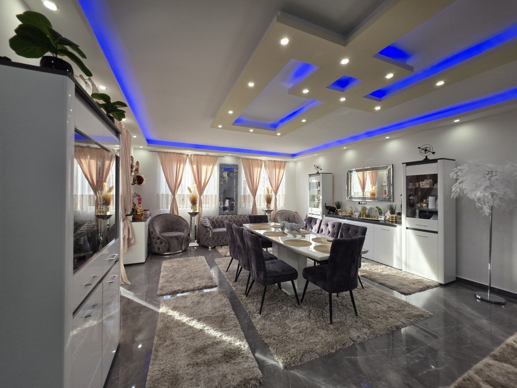 Elrendezése: előszoba, közlekedőből nyíló 3 db hálószoba (15.78 m2 – 12.22 m2, 12.01 m2), fürdő (wc, dupla mosdó, elektromos törölköző szárítós radiátor, tágas zuhanyzó illetve víz és csatorna kiállás sarokkád elhelyezéséhez), gépészeti helyiség, amerikai konyhás nappali étkezővel (47.52 m2), fedett terasz kapcsolattal (21.43 m2). Az ingatlan belső hasznos nettó alapterülete 127.11 m2.