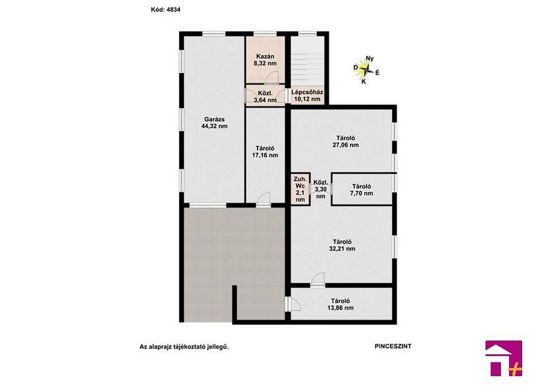 Pinceszint (170nm): garázs (44,32), kazánház-mosókonyha (8,32nm), közlekedő (3,64nm, 3,30nm), zuhanyzó-wc (2,1nm), tároló helyiségek (17,16nm, 27,06nm, 7,70nm, 32,21nm, 13,86nm), lépcsőház (10,12nm).