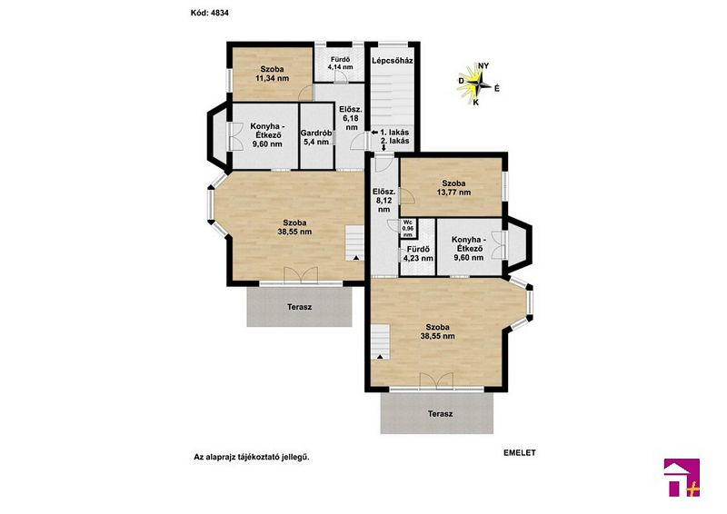 Emelet 2. lakás (br. 115,55nm + teraszok): előszoba-közlekedő (8,12nm), konyha-étkező (9,60nm), nappali (38,55nm), fürdő (4,23nm), wc (1nm), szoba (13,77nm), 2db terasz.