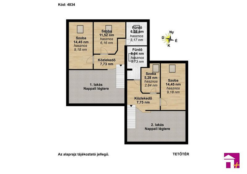 Tetőtér 2. lakás (br. 40,28nm): közlekedő (7,75nm), fürdő (8,04nm/5,73nm), 2 szoba (14,46nm/9,18nm és 5,28nm/2,84nm).