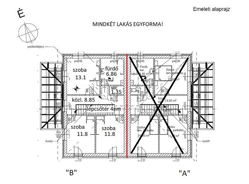 Emeleten: lépcsőház (4nm), közlekedő (8.85nm), wc (1.35nm), fürdő (6.86nm), 3 szoba (13.10nm és 2 db 11.80nm),