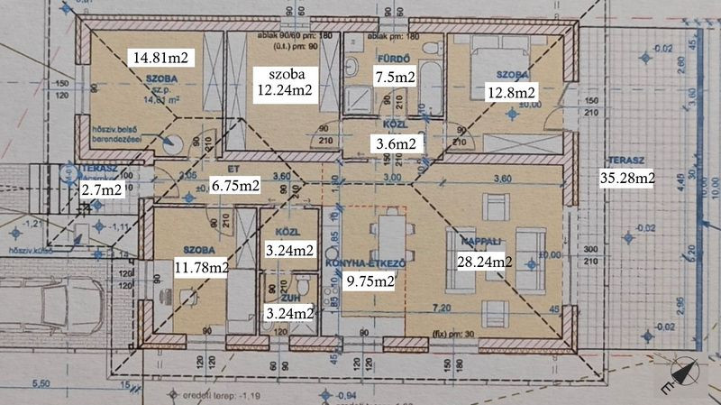 Az ingatlan felosztása a következő (nettó 113.95m2 lakótér + teraszok + fedett gk. beálló): elő-terasz (2.7m2), előszoba (6.75m2), közlekedő (3.24m2), konyha-étkező (9.75m2) - nappali (28.24m2), közlekedő (3.6m2), 2 fürdőszoba (3.24m2, 7.5m2), 4 szoba (14.81m2, 12.24m2, 11.78m2, 12.8m2), terasz 35.28m2).