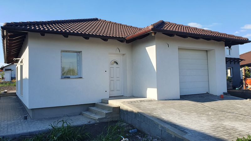 Rövid műszaki ismertető: C16-os vasbeton sávalap, vasalt aljzaterősítéssel. Bakonytherm 30 NF tégla főfalak + 15cm-es dryvit szigetelés. 10-es tégla válaszfalak. A külső nyílászárók műanyag szerkezetűek, bukó - nyíló kivitelben, 5 légkamrás, 3 rétegű thermoplan üvegezéssel ellátva. A belső ajtók fa szerkezetűek. Az ablakok külső és belső párkánya műkőből készül. Cserép fedésű tető.