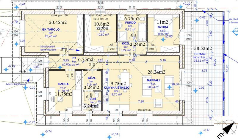 Az ingatlan felosztása a következő (nettó 94.79m2 lakótér + terasz + 1 gk-s garázs): elő-terasz, előszoba (6.75m2), közlekedő (3.24m2), konyha-étkező (9.75m2) - nappali (28.24m2), közlekedő (3.24m2), 2 fürdőszoba (3.24m2, 6.75m2), 3 szoba (11.78m2, 11m2, 10.8m2), terasz 38.52m2).