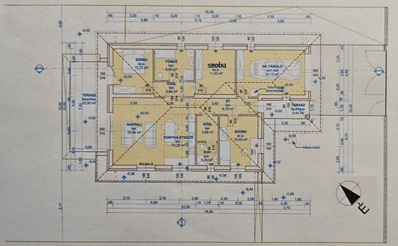 Rövid műszaki ismertető: C16-os vasbeton sávalap, vasalt aljzaterősítéssel. Bakonytherm 30 NF tégla főfalak + 15cm-es dryvit szigetelés. 10-es tégla válaszfalak. A külső nyílászárók műanyag szerkezetűek, bukó - nyíló kivitelben, 5 légkamrás, 3 rétegű thermoplan üvegezéssel ellátva. A belső ajtók fa szerkezetűek. Az ablakok külső és belső párkánya műkőből készül. Cserép fedésű tető.