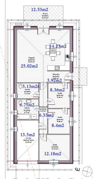Az ingatlan felosztása a következő (103.82m2 + terasz): előszoba (3.92m2), konyha-étkező (14.23m2) - nappali (25.02m2), közlekedő (6.33m2), fürdőszoba + wc (6.75m2), tároló + wc (5.13m2), 3 szoba (8.36m2, 8.4m2, 12.18m2), 1 gk-s garázs (13.5m2), terasz (12.53m2).