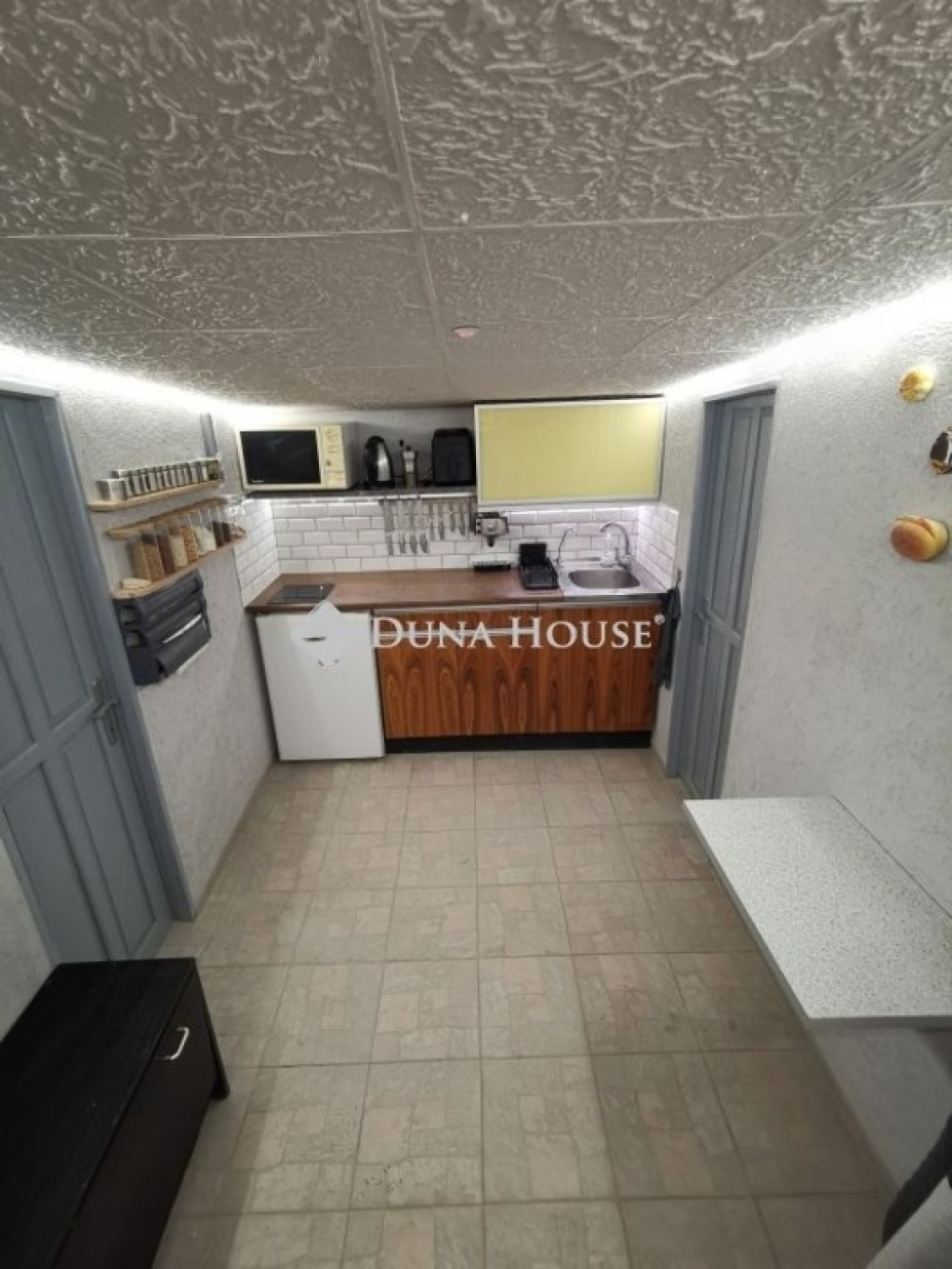 - Ház oldalán lépcsőn keresztül felérve közelíthetjük meg az első szintet, mely az eredeti tervek alapján egy szuterén szint, itt található a mostani lakótér . Főbejáraton belépve jó méretű előszoba, beépített gardrób, tágas nappali teraszkapcsolattal, 2 szoba, 1 konyha, fürdőszoba, tároló és egy kazánház található. Ezen a szinten 2,2 méter a belmagasság, nettó 110 m2-es.