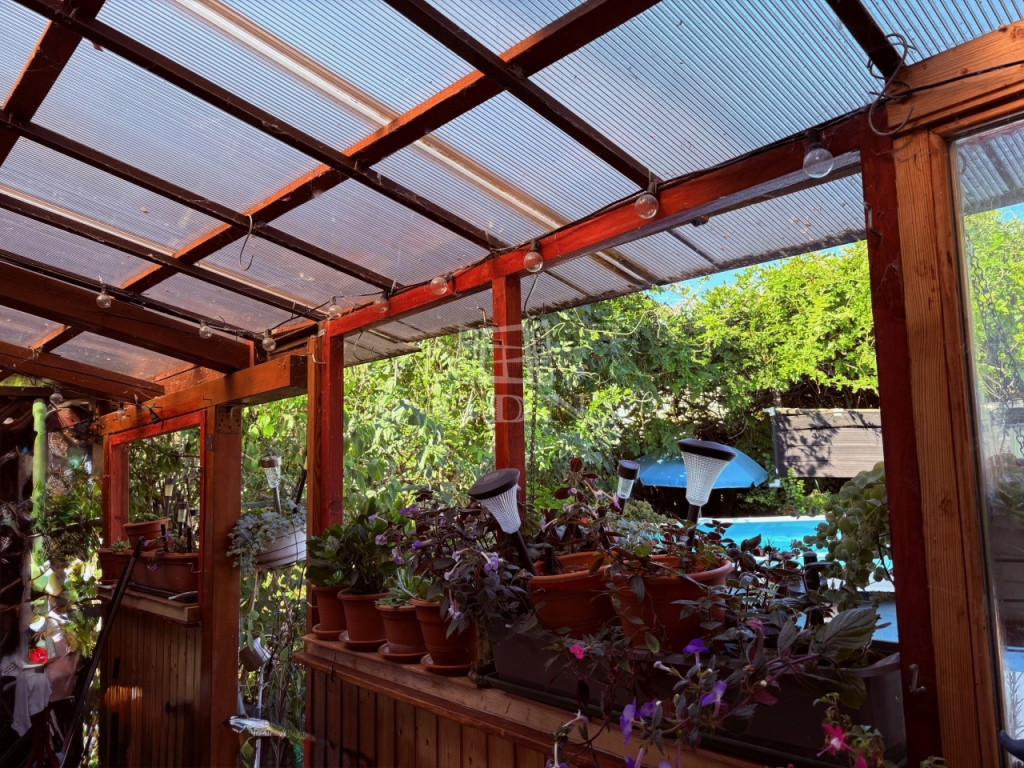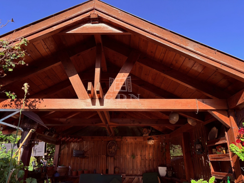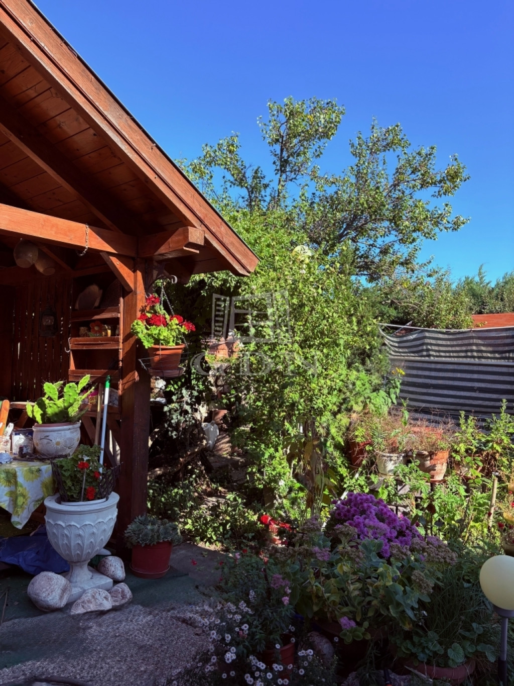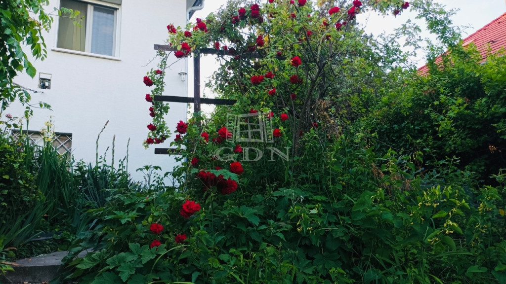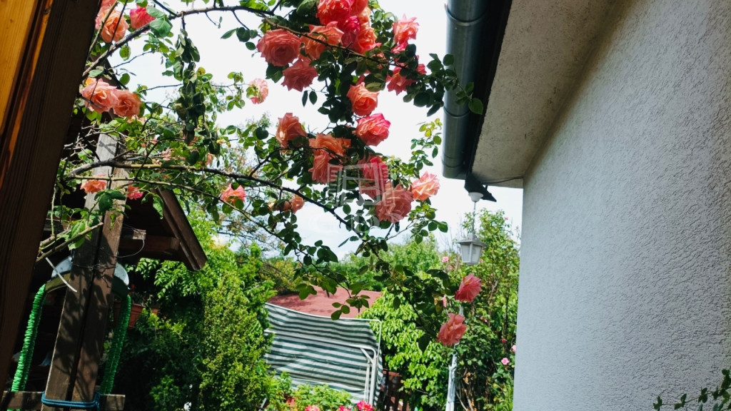 Az ingatlant gyönyörű, virágos előkert öleli körül, amely már érkezéskor különleges hangulatot teremt. A bejárat előtt fedett előtér, valamint egy hatalmas fa pergola biztosít kellemes pihenőhelyet a mindennapokban és baráti összejöveteleken egyaránt.