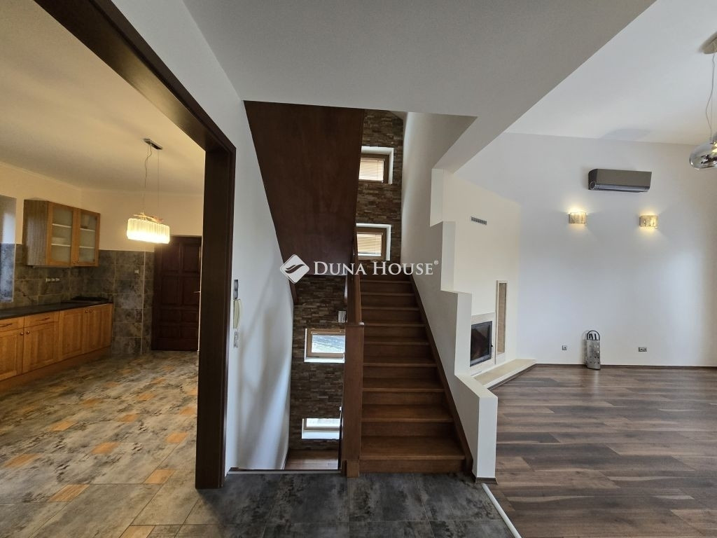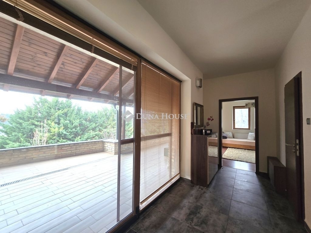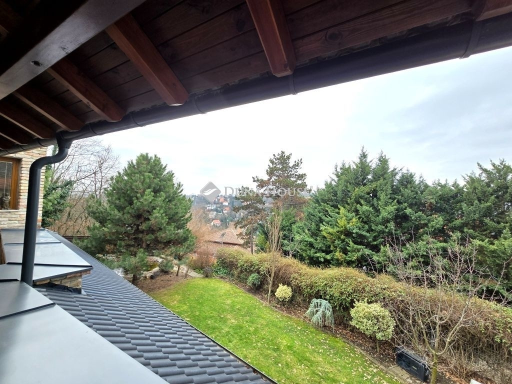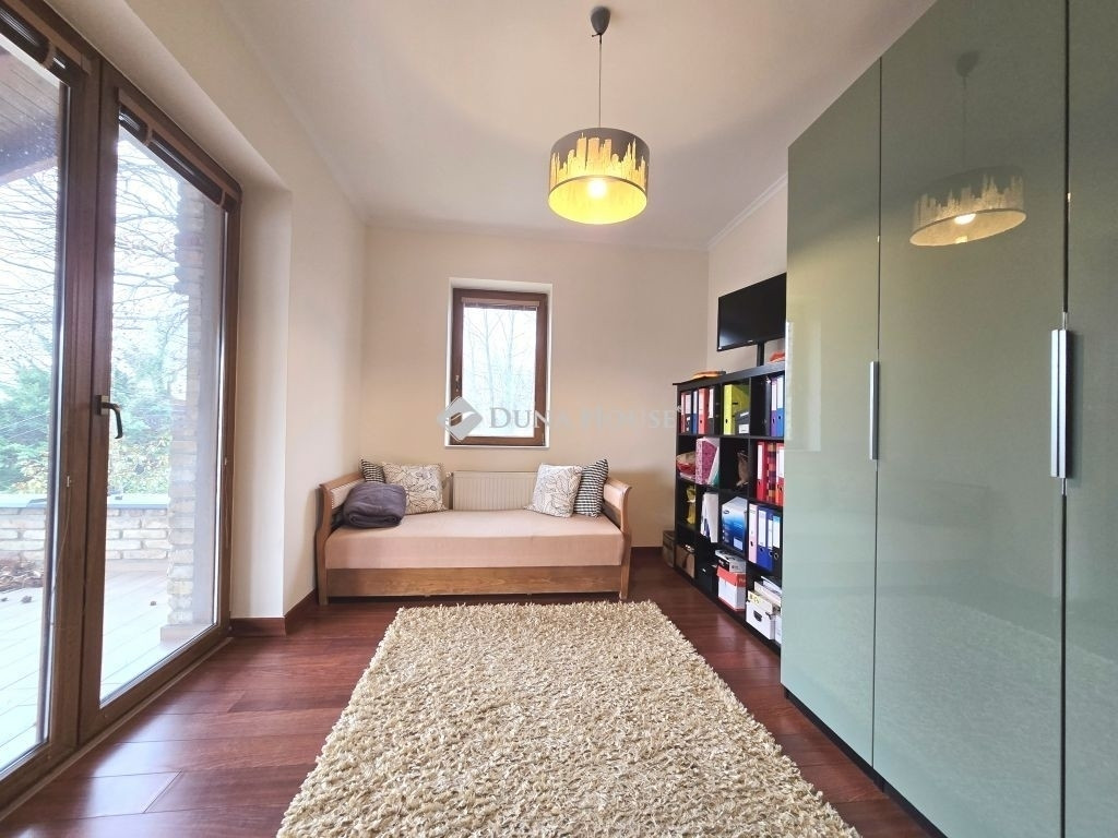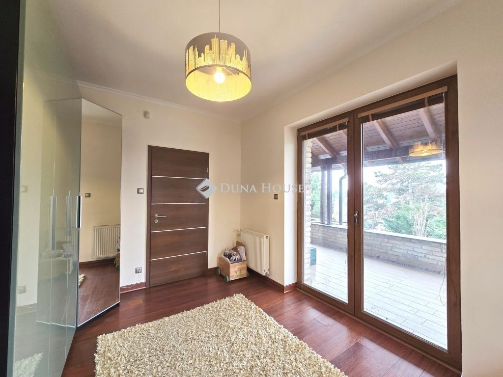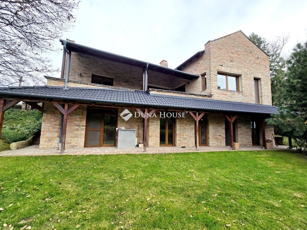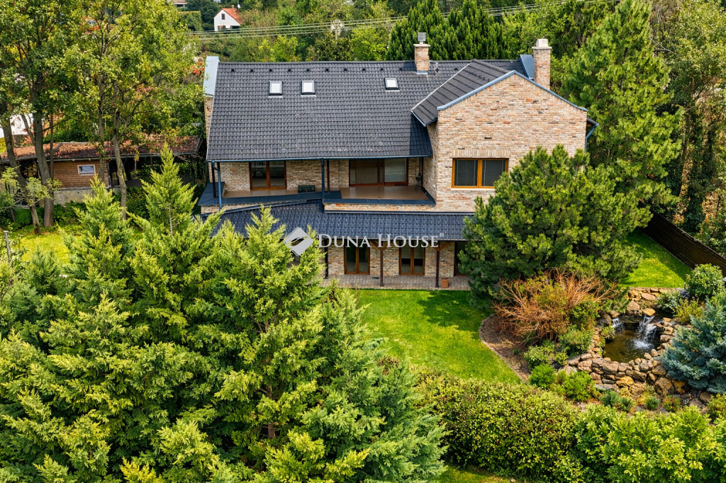 AZ ERDŐ CSENDJÉBEN!KÜLÖNLEGES ÖRÖKPANORÁMÁS HÁZ ÉRDLIGET ŐSFÁS RÉSZÉN!EGYEDÜLÁLLÓ ÉPÍTÉSZETI MEGOLDÁSOK----FENNTARTHATÓSÁG----PARKOSÍTOTT KERT DÍSZTÓVAL, MEDENCÉVEL!Eladó Érdliget legszebb és legromantikusabb részén, helyi jelentőségű természetvédelmi területen egy nettó 256 nm-es egyedi és impozáns családi ház 1080 nm-es parkosított saroktelken.A ház 2005-ben épült Zsuffa Zsolt Ybl Miklós-díjas építész tervei alapján. A három szintes ingatlanban egy nagy belmagasságú nappali, konyha/étkező, 6 hálószoba és 4 fürdőszoba került kialakításra gardróbokkal, tárolókkal. Az alsó szint nettó 118 nm-es, a nappali szintje nettó 88 nm-es, a tetőtér kb. nettó 50 nm-es, a garázs 30 nm-es, a hátsó fedett terasz 34,55 nm-es, a főbejárat előtti fedett terasz pedig 6,7 nm-es.A ház belső térkialakítása harmonikusan illeszkedik a hely domborzatához: az utcaszinten helyezkedik el a konyha étkezővel, vendégszoba a hozzátartozó fürdőszobával és a tágas, nagy belmagasságú nappali, melynek különlegessége, hogy kertkapcsolat helyett egy hatalmas, közel 35 nm-es, gyönyörű panorámával rendelkező fedett terasz tartozik hozzá. Az alsó szint rendelkezik közvetlen kertkapcsolattal, az itt található 3 hálószoba mindegyikéből kijuthatunk a medencéhez, dísztóhoz.Parkolni egy házkapcsolatos 30 nm-es garázsban lehet, illetve további két autó egy-egy fedett autóbeállóra állhat be automata kapukon keresztül.További kényelmi extrák: hobbiszoba, háztartási helyiség, kb. 15 nm-es kerti tároló, öntözőrendszer, 3X4 m-es eltolható tetejű, fűtött masszázs medence kerti zuhannyal.Műszaki tartalom: 30-as PRTH falak kb. 13 cm-es kézzel válogatott bontott tégla díszborítás, fenyőfa nyílászárók. A tulajdonosok folyamatosan korszerűsítették, modernizálták az ingatlant: 2010-ben fejezték be az alsó szint kialakítását, a tetőtér pedig friss beépítés. A klímák energiatakarékosak, fűtésre is optimalizáltak, a kandalló szintén korszerű. A fűtésrendszer tavaly újult meg: vadonatúj Stiebel Eltron hőszivattyú került telepítésre. Az épület az energetikai besorolása B kategória.Az ingatlan 1/1-es tulajdonban van, tehermentes, gyorsan költözhető.