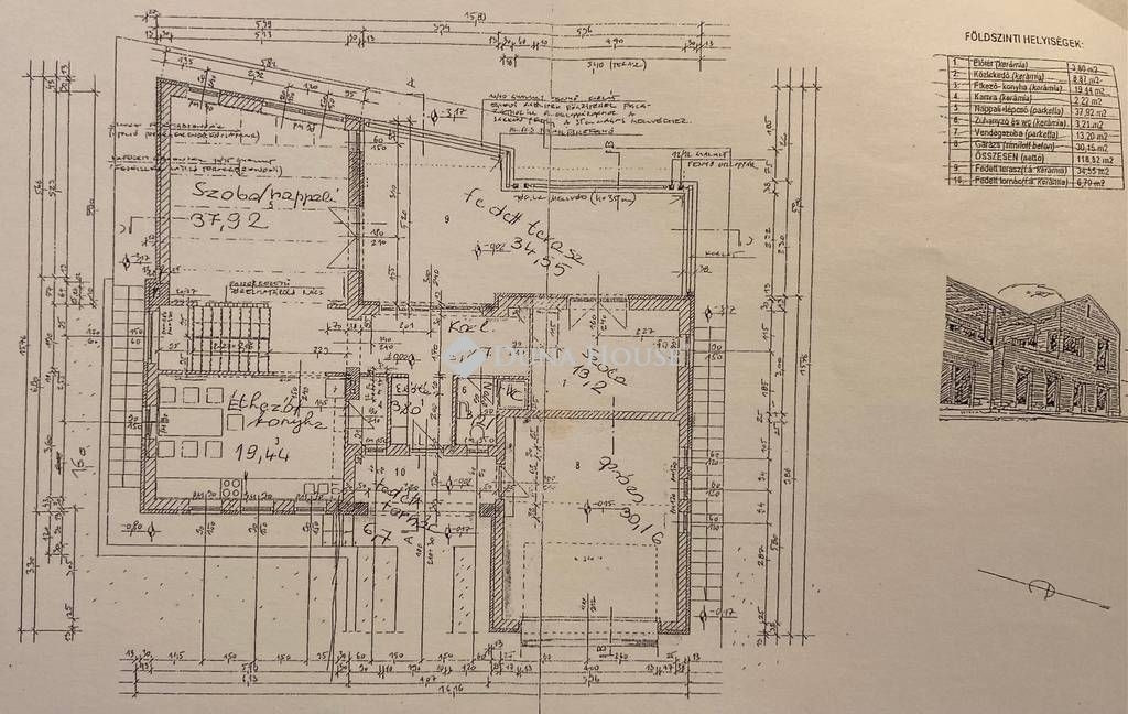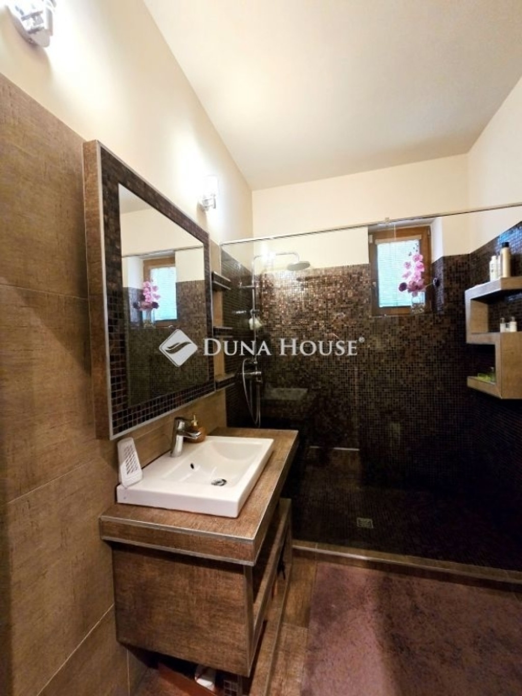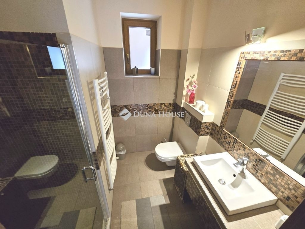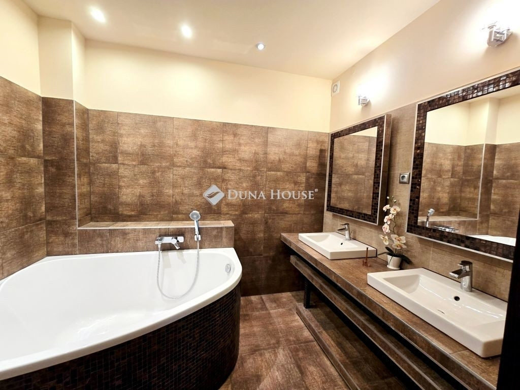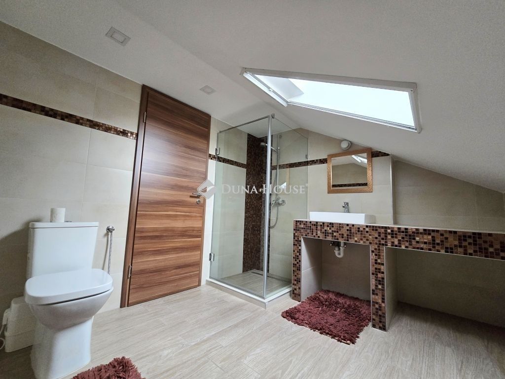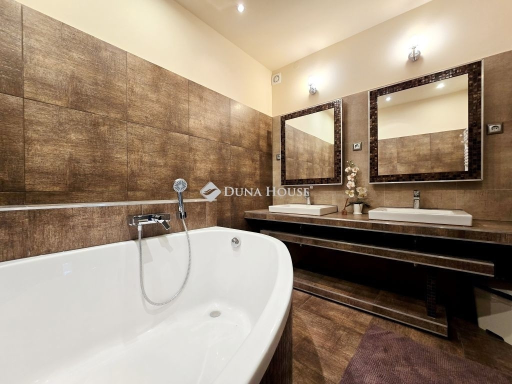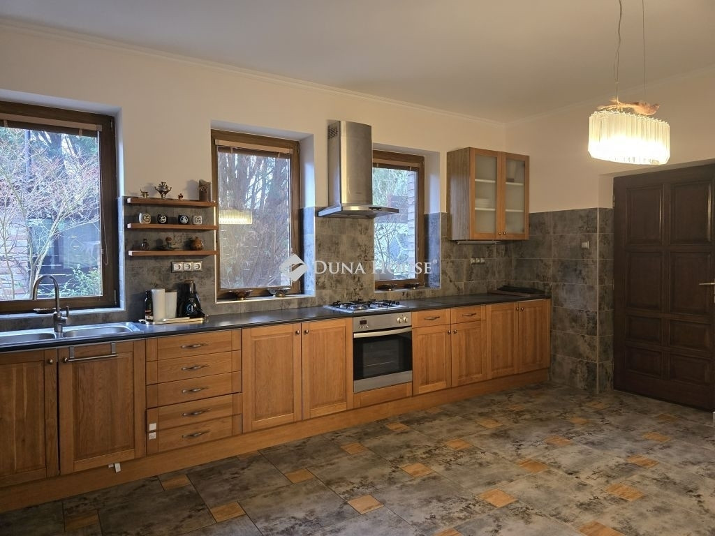 AZ ERDŐ CSENDJÉBEN!KÜLÖNLEGES ÖRÖKPANORÁMÁS HÁZ ÉRDLIGET ŐSFÁS RÉSZÉN!EGYEDÜLÁLLÓ ÉPÍTÉSZETI MEGOLDÁSOK----FENNTARTHATÓSÁG----PARKOSÍTOTT KERT DÍSZTÓVAL, MEDENCÉVEL!Eladó Érdliget legszebb és legromantikusabb részén, helyi jelentőségű természetvédelmi területen egy nettó 256 nm-es egyedi és impozáns családi ház 1080 nm-es parkosított saroktelken.A ház 2005-ben épült Zsuffa Zsolt Ybl Miklós-díjas építész tervei alapján. A három szintes ingatlanban egy nagy belmagasságú nappali, konyha/étkező, 6 hálószoba és 4 fürdőszoba került kialakításra gardróbokkal, tárolókkal. Az alsó szint nettó 118 nm-es, a nappali szintje nettó 88 nm-es, a tetőtér kb. nettó 50 nm-es, a garázs 30 nm-es, a hátsó fedett terasz 34,55 nm-es, a főbejárat előtti fedett terasz pedig 6,7 nm-es.A ház belső térkialakítása harmonikusan illeszkedik a hely domborzatához: az utcaszinten helyezkedik el a konyha étkezővel, vendégszoba a hozzátartozó fürdőszobával és a tágas, nagy belmagasságú nappali, melynek különlegessége, hogy kertkapcsolat helyett egy hatalmas, közel 35 nm-es, gyönyörű panorámával rendelkező fedett terasz tartozik hozzá. Az alsó szint rendelkezik közvetlen kertkapcsolattal, az itt található 3 hálószoba mindegyikéből kijuthatunk a medencéhez, dísztóhoz.Parkolni egy házkapcsolatos 30 nm-es garázsban lehet, illetve további két autó egy-egy fedett autóbeállóra állhat be automata kapukon keresztül.További kényelmi extrák: hobbiszoba, háztartási helyiség, kb. 15 nm-es kerti tároló, öntözőrendszer, 3X4 m-es eltolható tetejű, fűtött masszázs medence kerti zuhannyal.Műszaki tartalom: 30-as PRTH falak kb. 13 cm-es kézzel válogatott bontott tégla díszborítás, fenyőfa nyílászárók. A tulajdonosok folyamatosan korszerűsítették, modernizálták az ingatlant: 2010-ben fejezték be az alsó szint kialakítását, a tetőtér pedig friss beépítés. A klímák energiatakarékosak, fűtésre is optimalizáltak, a kandalló szintén korszerű. A fűtésrendszer tavaly újult meg: vadonatúj Stiebel Eltron hőszivattyú került telepítésre. Az épület az energetikai besorolása B kategória.Az ingatlan 1/1-es tulajdonban van, tehermentes, gyorsan költözhető.