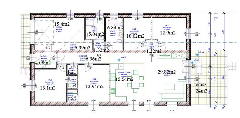 Az ingatlan felosztása a következő (nettó 125.17m2 lakótér + 1 gk-s garázs + terasz): előtér (4.08m2), 3 közlekedő (6.96m2, 1.32m2, 1.32m2), konyha - étkező (15.54m2) - nappali (29.82m2), kamra (1.21m2), 2 gardrób (1.54m2 / db.), fürdőszoba + wc (6.84m2), háztartási helyiség zuhanyzóval + wc (5.04m2), garázs - tároló (15.4m2, 5.39m2), terasz (24m2).