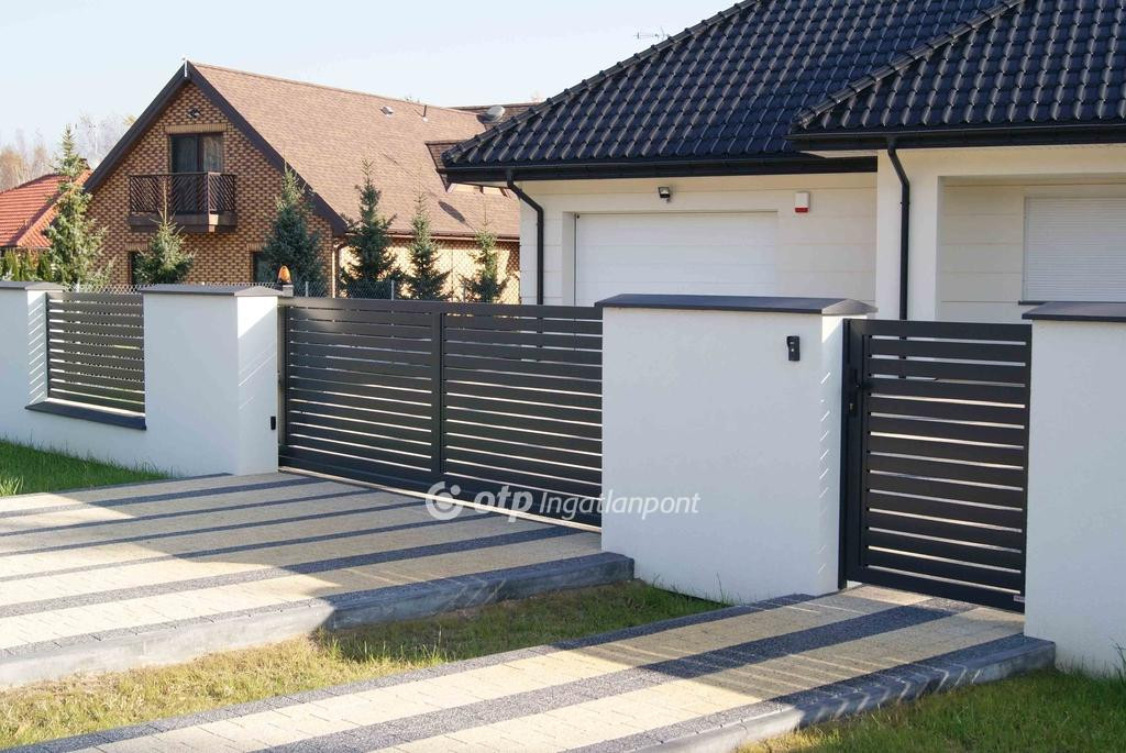 A kerítés beton zsalukőből készült, 4 méteres motorral szerelt úszókapuval, melyben benne van a kiskapu is.
