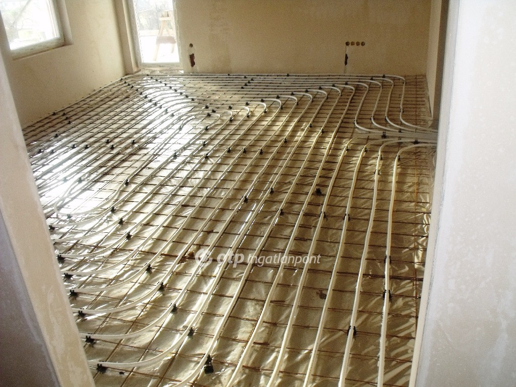 Gépi gipszes vakolat (Knauf), 6 cm-es lépésálló hungarocell szigetelés + esztrich beton