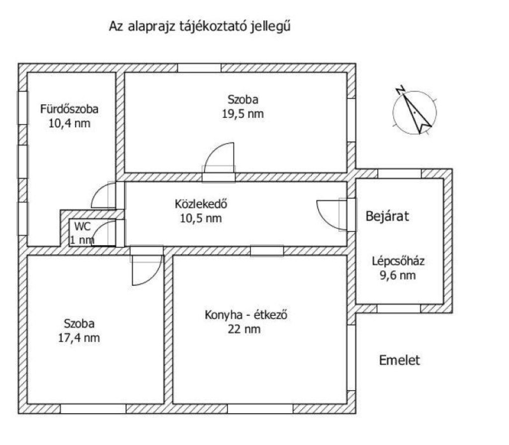 Helyiségei: A földszinten található előtér/lépcsőház, egy hálószoba, egy nagyméretű tároló, mely konyhának van tervezve. Innen nyílhatna egy fürdőszoba. Az emeleten kapott helyet egy tágas konyha étkezővel, 2 szoba, egy fürdőszoba WC-vel és egy különálló mellékhelység! A házban külön található még egy körülbelül 40 m2-es garázs, valamint az udvarban egy 20 m2-es könnyűszerkezetes tároló.