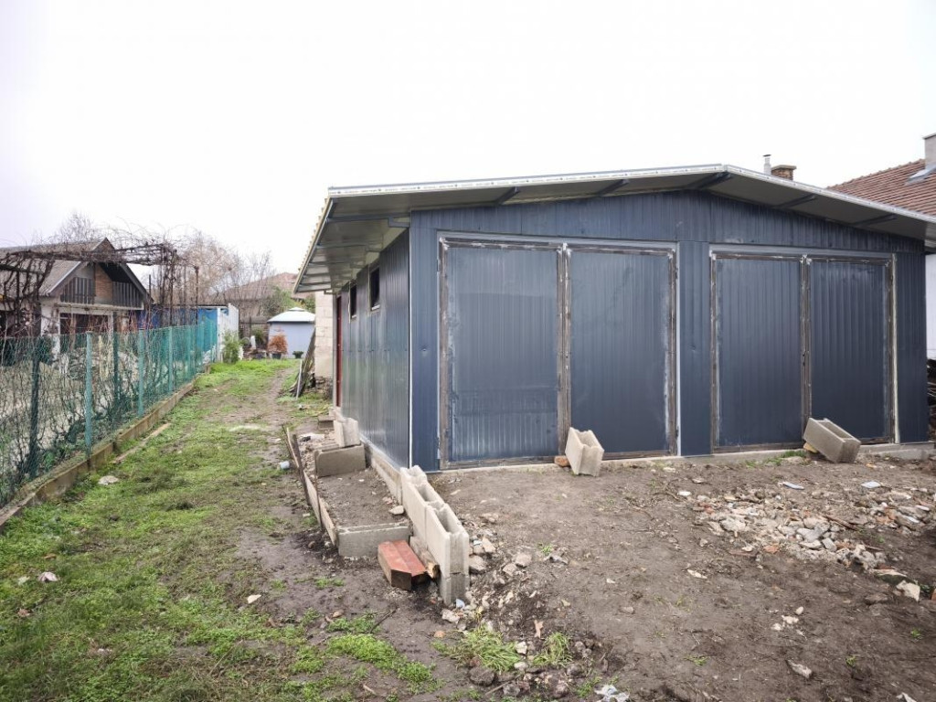 A telek 840 nm, két utcára nyílik. A házba murvás utca felől jutunk, a garázsba pedig aszfalt burkolatún. Ezen az oldalon épült meg a kétállásosgarázs, ami 5cm-es szendvics panelből plusz belső 5cm-es kőzetgyapottal szigetelt. a vázszerkezet 50mm-es zártszelvényből készült.
