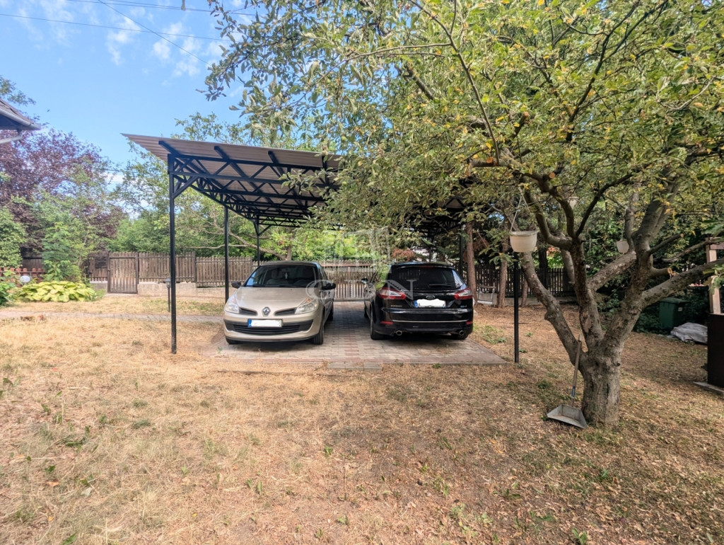 A fedett, dupla kocsibeálló kényelmesen közelíthető meg, a kapu távirányítóval vezérelhető.