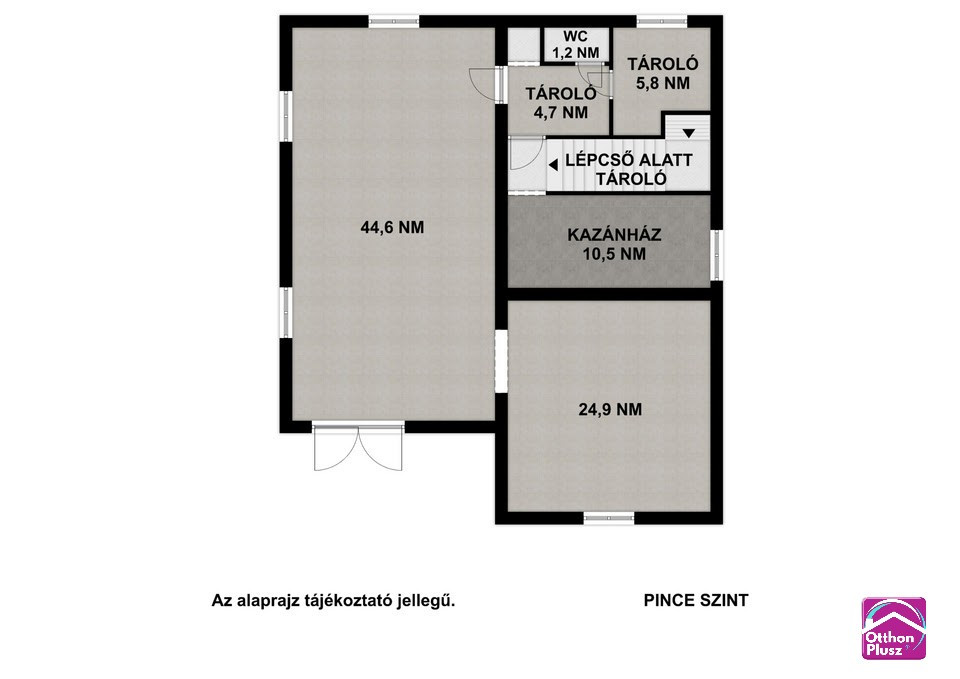 Pince szint (91.25m2): garázs (44.6m2), kazánház (10.05m2), műhely (24.9m2), tároló (4.7m2), tároló (5.8m2), wc (1.2m2), lépcsőház.