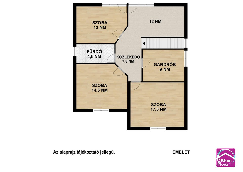 Emelet (78.4m2): közlekedő (7.8m2), fürdőszoba (4.6m2), szoba (13m2), társalgó - nappali (12m2), gardrób (9m2), szoba (17.5m2), szoba (14.5m2).