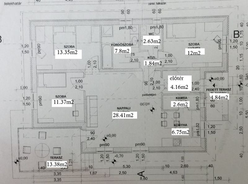 Az ingatlan felosztása a következő (nettó 90.91m2 lakótér + teraszok): elő - terasz (4.84m2), előtér (4.16m2), nappali (28.41m2) - konyha -étkező (6.75m2), kamra (2.6m2), közlekedő (1.84m2), wc (2.63m2), fürdőszoba (7.8m2), 3 szoba (12m2, 13.35m2, 11.37m2), terasz (13.38m2).