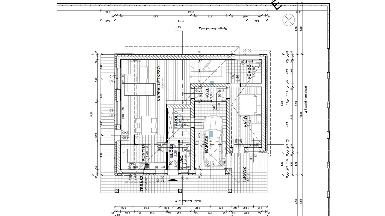 Az ingatlan földszintjén, mely 93 m2 (+39 m2 terasz), egy tágas amerikai-konyhás nappali (45 m2); 14 m2-es szoba saját 6 m2-es fürdőszobával; házkapcsolatú garázs (16 m2); kézmosó-WC (2,4 m2); előtér; tároló (5 m2), és a szinteket összekötő lépcsőház található.