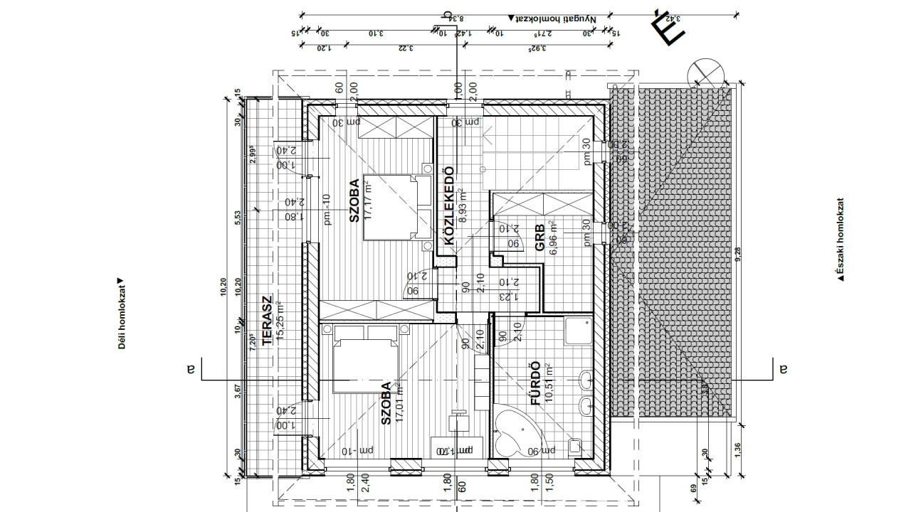 Az emeleten (nem tetőtér), mely 61 m2 a közlekedőről (8.9 m2) nyílóan 2 hálószoba (17; 17 m2), fürdőszoba (10,5 m2), gardrób (7 m2) került kialakításra.