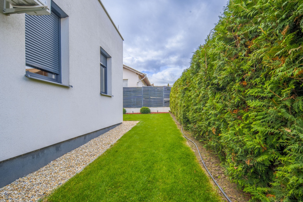 A kert parkosított, rendszeresen gondozott, öntözőrendszerrel ellátott. Helyet kapott egy kültéri medence, és egy süllyesztett jakuzzi is, amely természetesen a vételár részét képezi.