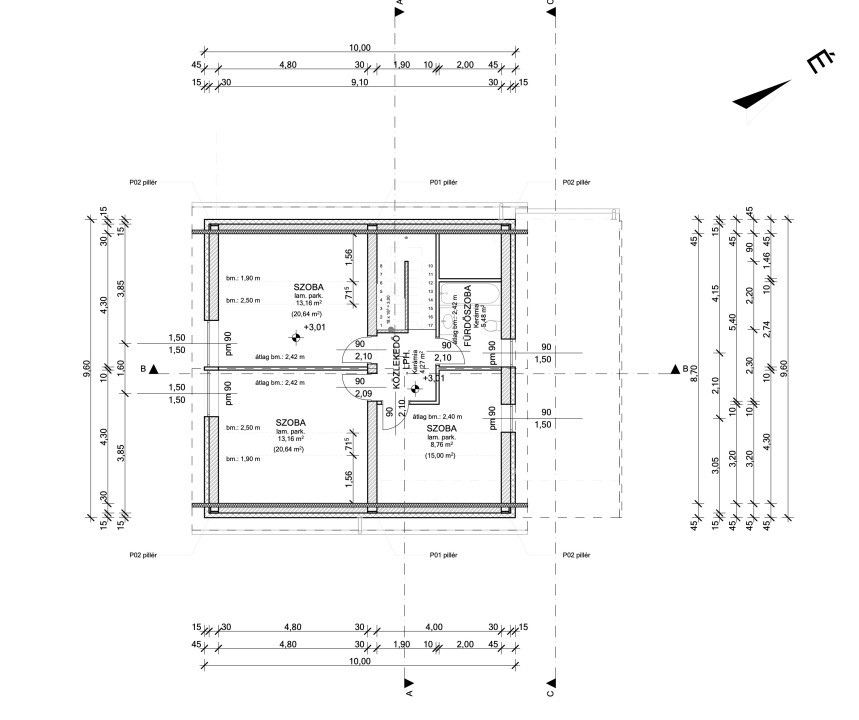 Emeleten:3 szoba (13,16m2, 13,16 m2, 8,76m2), közlekedő (4,27m2), fürdőszoba (5,48m2)