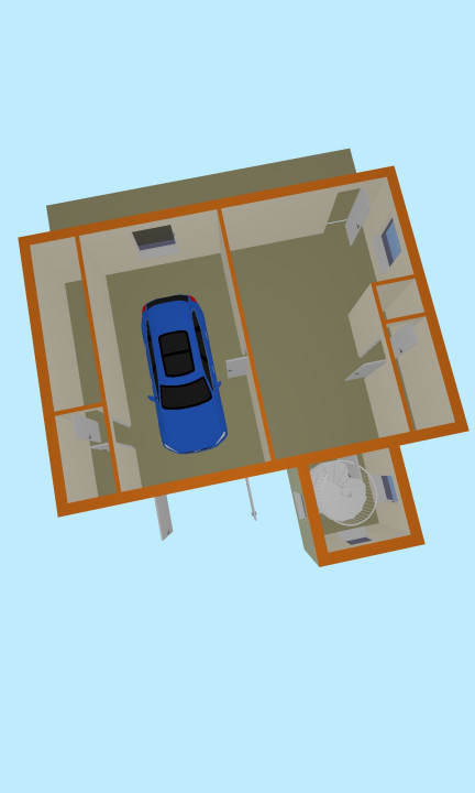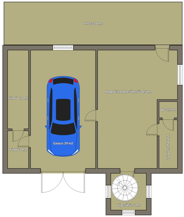 A földszinten, 78 m2-en konyha-étkező-nappali, zuhanyzó-WC, garázs, és 2 tároló, valamint az emeletre vezető lépcsőház található. Akár a garázson keresztül vagy a hátsó kert felé eső teraszról is megközelíthető.