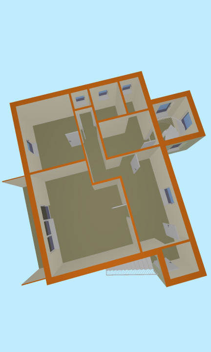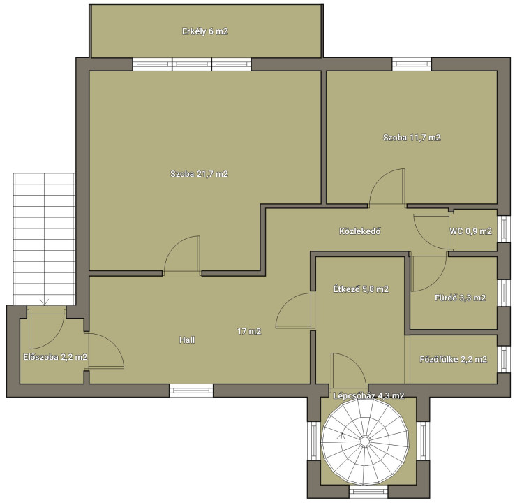 Az emeleten (NEM TETŐTÉR) 64 m2-en 2 szoba (21,7 és 11,7 m2) + 17 m2 hall ami könnyedén ~ 14 m2-es hálószobává alakítható, főzőfülke ablakkal, előszoba, fürdőszoba, WC, helyiségek és a nagyszobával kapcsolatos erkély kerültek kialakításra. Ez a szint nem csak a lépcsőházon, hanem külső feljárón keresztül egy széles betonlépcsőn is megközelíthető.