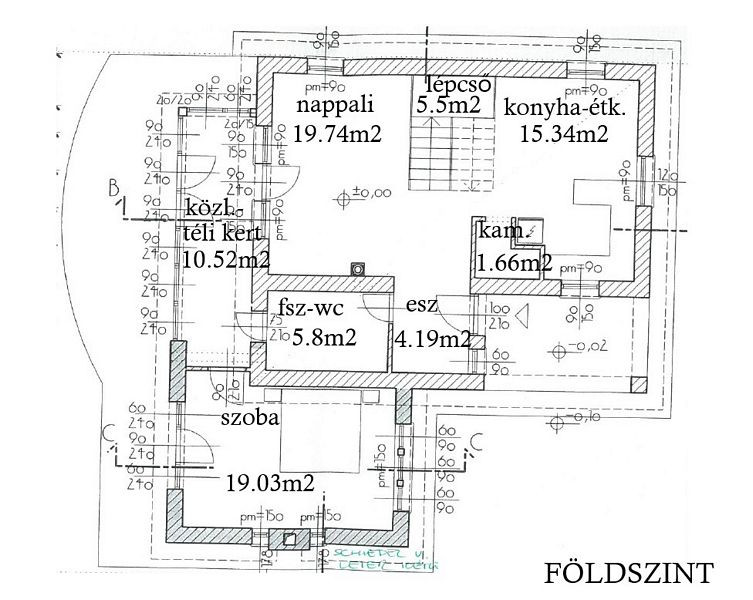 Földszint (81.77m2 + fedett elő - terasz kb. 8m2): előszoba (4.19m2), nappali (19.74m2), konyha - étkező (15.34m2), kamra (1.66m2), lépcső (5.5m2), fürdőszoba + wc (5.8m2), közlekedő - téli kert (10.52m2), szoba (19.03m2).