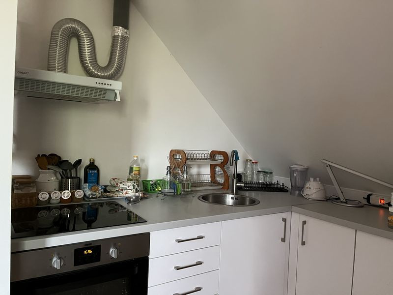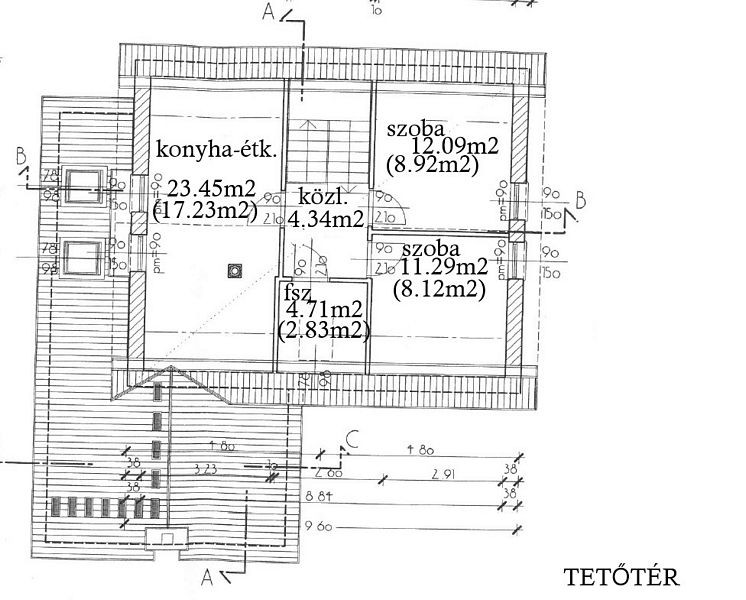 Tetőtér (nettó 55.88m2, hasznos 41.44): közlekedő (4.34m2), konyha - étkező (23.45m2 / 17.23m2), szoba (12.09m2 / 8.92m2), szoba (11.29m2 / 8.12m2), fürdőszoba + wc (4.71m2 / 2.83m2).