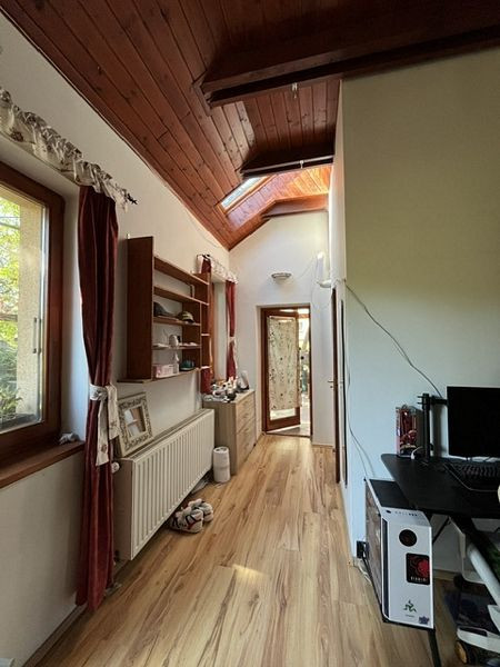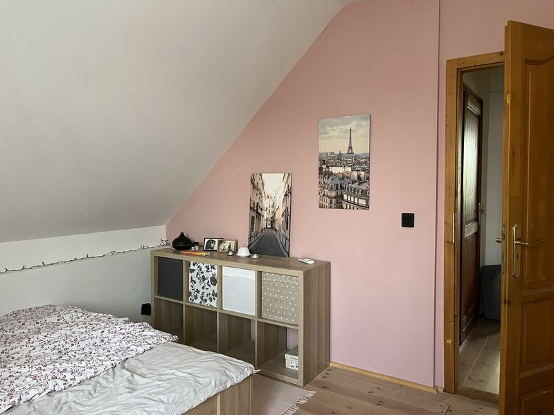 Érd Tuscculanum részén csendes, családi házas övezetben 757m2-es telken tetőtér beépítéses, belső kétszintes, nappali + 3 szobás, 2 konyhás, dupla komfortos, összesen nettó 137.65m2-es (+ terasz), két generációs önálló családi ház eladó.