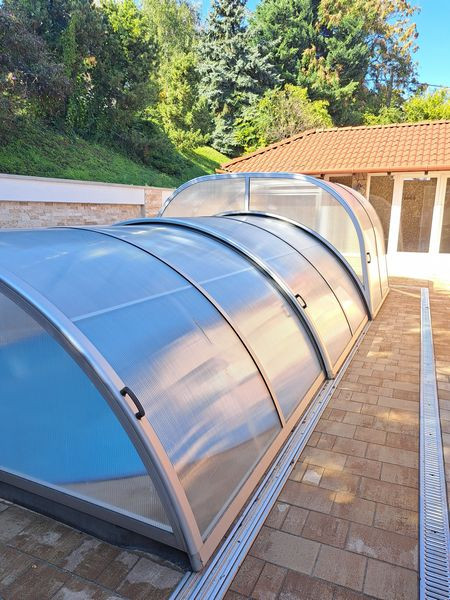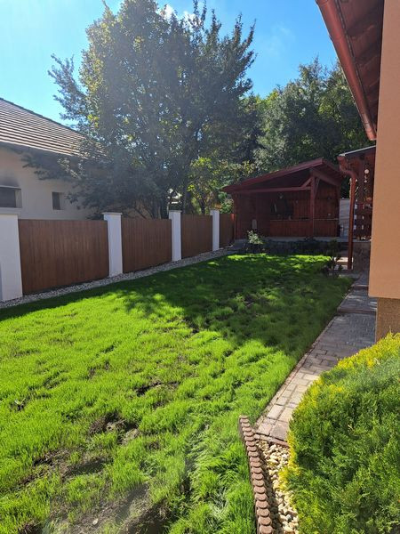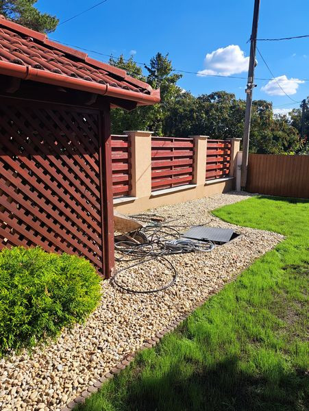 A kert parkosítása folyamatban, és a medence körüli burkolat teljes cseréje is. Új utcafronti lemezkerítés is lesz.