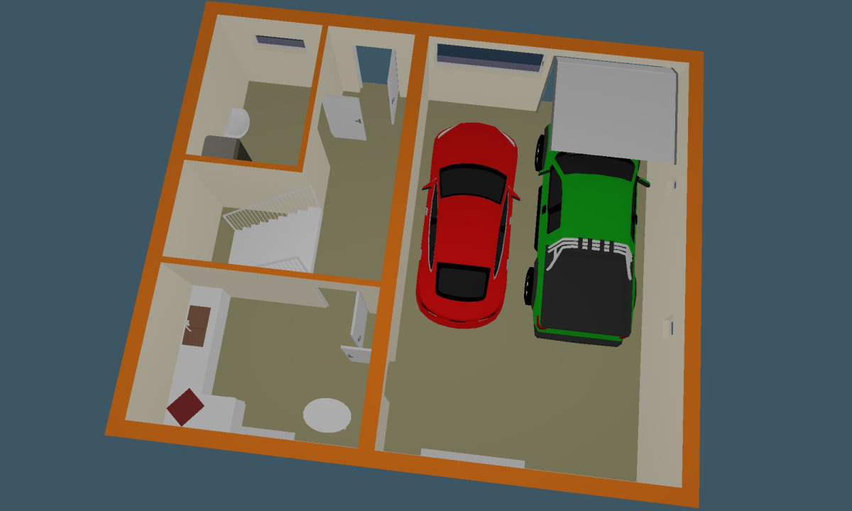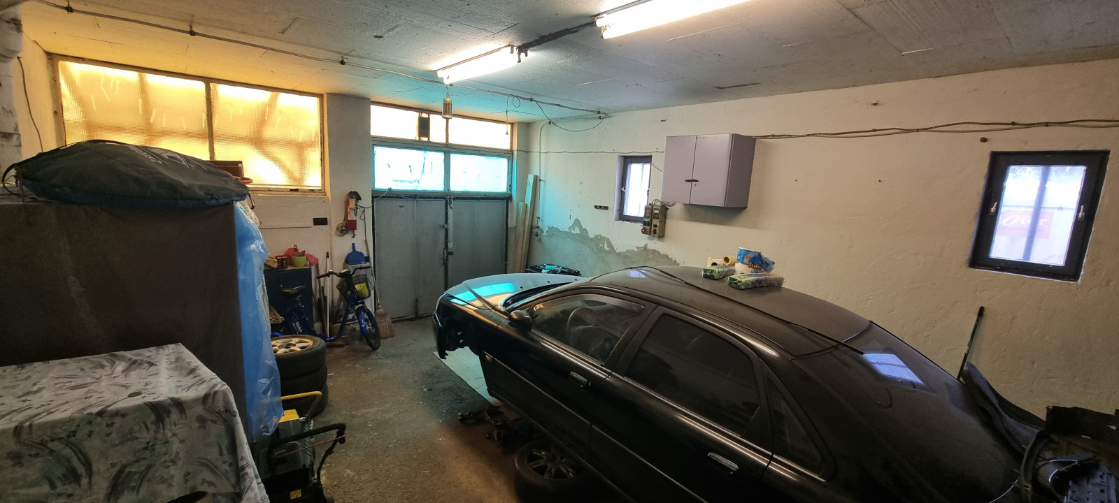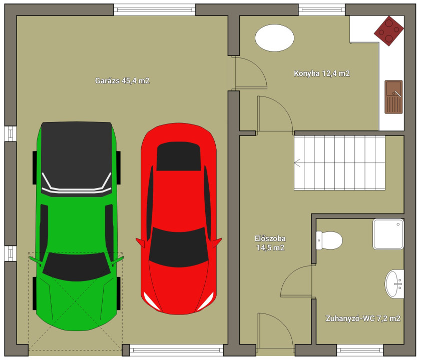 A földszint 80 m2. Előszoba, garázs (45 m2), konyha-étkező és zuhanyzó-WC helyiségekből áll.