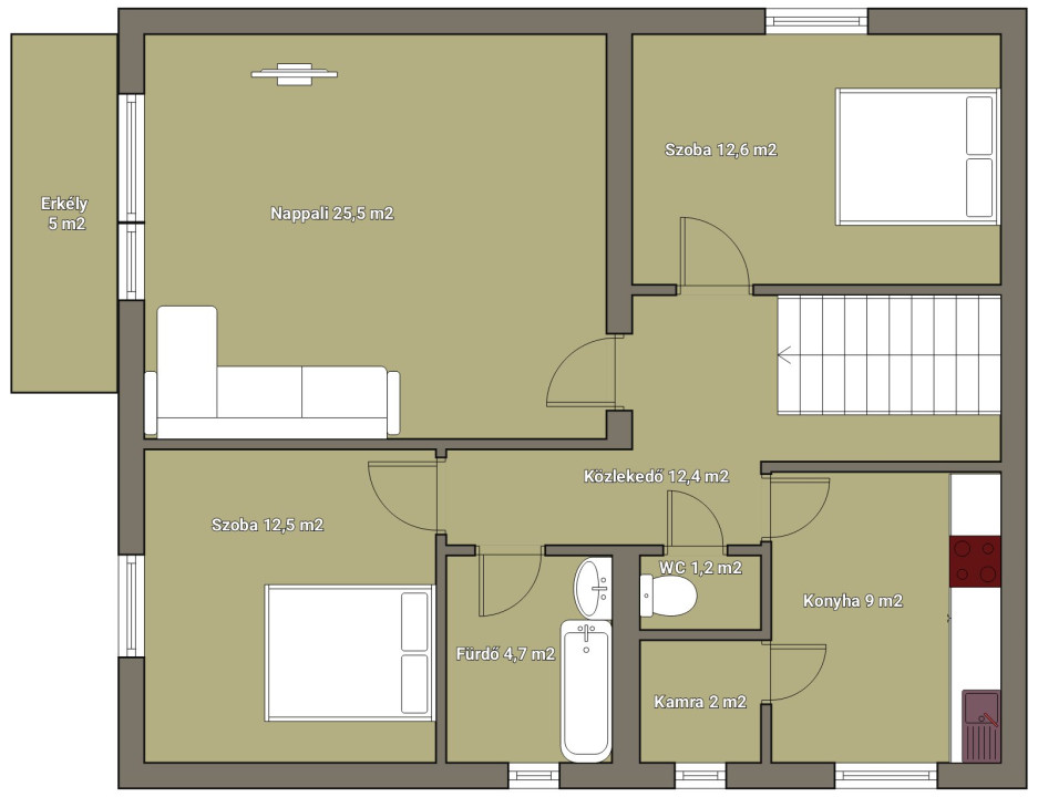 Az emeleten, 80 m2-en + terasz (5 m2), 2 hálószoba (12,6 és 12,5 m2), nappali (25,5 m2), konyha-étkező kamrával, fürdőszoba, WC került kialakításra.