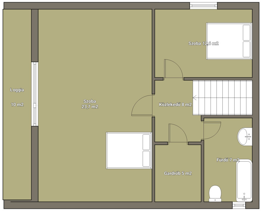 A tetőtérben 56 m2-en + loggia (10 m2) közlekedőről nyílóan 2 szoba (23,7 és 12,6 m2), gardrób és fürdőszoba-WC található.