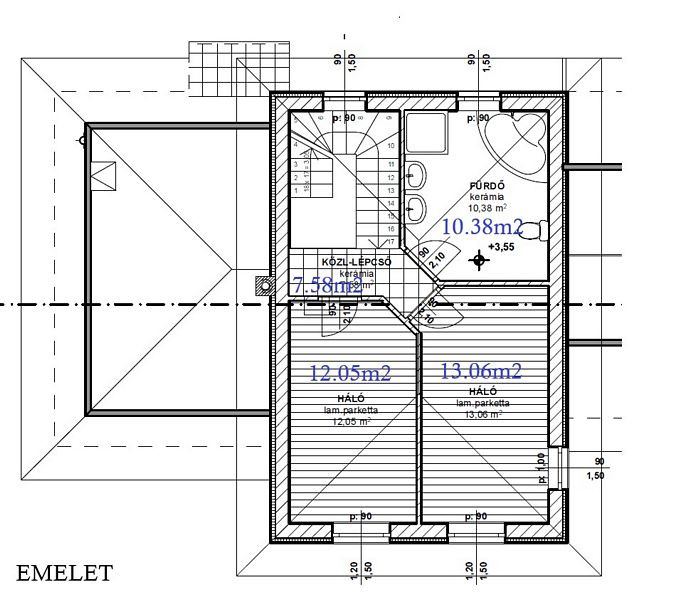 Emelet (43.07m2): közlekedő - lépcső (7.58m2), fürdőszoba + wc (10.38m2), 2 szoba (12.05m2, 13.06m2).