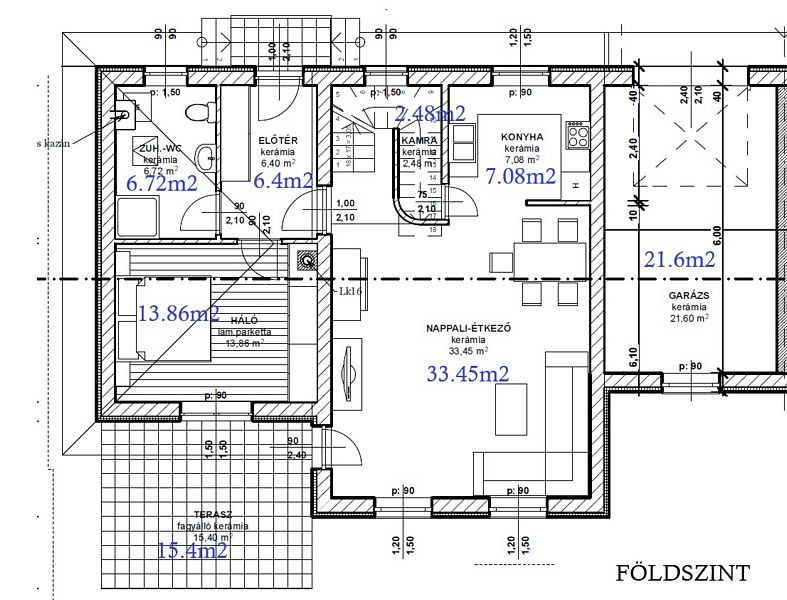 Földszint (nettó 69.99m2 lakótér + garázs + terasz): előtér (6.4m2), fürdőszoba + wc (6.72m2), kamra (2.48m2), konyha (7.08m2) - nappali - étkező (33.45m2), szoba (13.86m2), garázs (21.6m2), terasz (15.4m2).