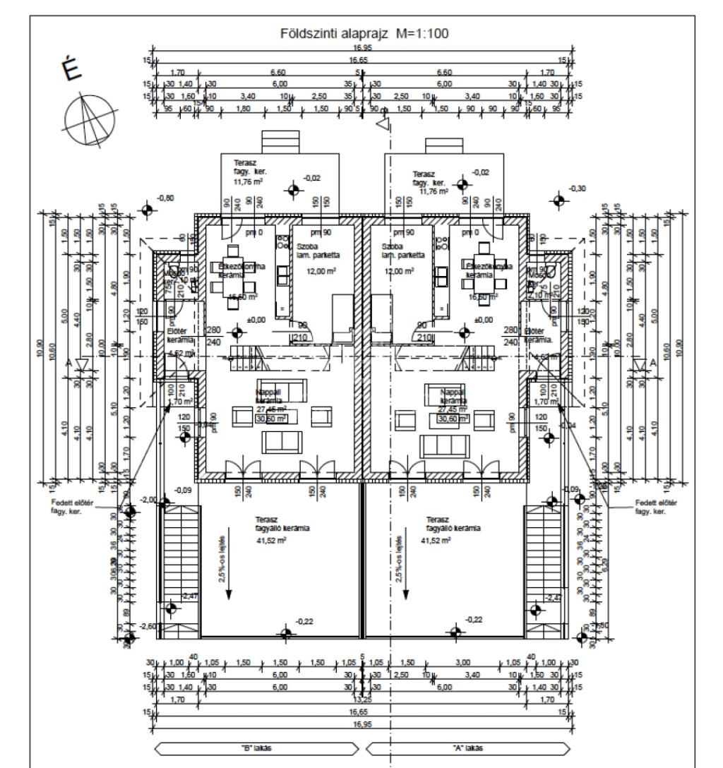 A házhoz tartozik egy 41 négyzetméteres terasz is, tökéletes hely a kikapcsolódásra és a családi összejövetelekre. A terasz a felső szinten található, hiszen ahogy a látványterveken is látható, a garázs tetejére került kialakításra.