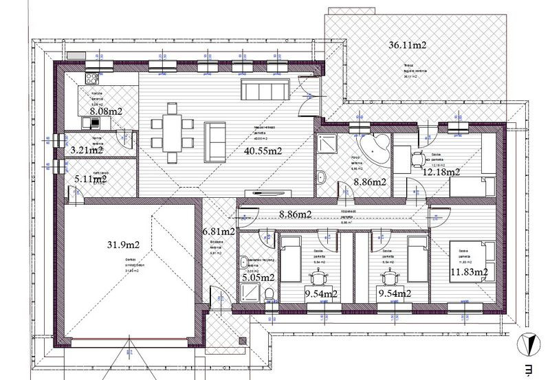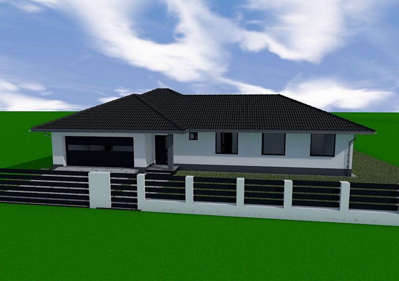 A ház felosztása a következőképpen alakul (nettó 129.62m2 lakótér + dupla garázs + teraszok) : elő-terasz, előszoba (6.81m2), nappali-étkező (40.55m2), konyha (8.08m2), kamra (3.21m2), közlekedő (8.86m2), fürdő-wc (8.86m2), háztartási helyiség-wc (5.05m2), tároló (5.11m2), 4 szoba (12.18m2, 11.83m2, 9.54m2, 9.54m2), 2 gk-s garázs (31.90m2), terasz (36.11m2).