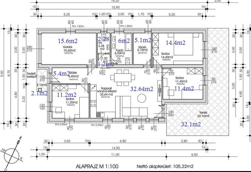 Az ingatlan felosztása a következő (nettó 89.62m2 lakótér + garázs + teraszok): elő - terasz (2.1m2), előtér (5.4m2), nappali - konyha - étkező (32.64m2), közlekedő (1.2m2), fürdőszoba + wc (6m2), wc (2.28m2), tároló / gardrób (5.1m2), 3 szoba (11.2m2, 11.4m2, 14.4m2), garázs (15.6m2), terasz (32.1m2).